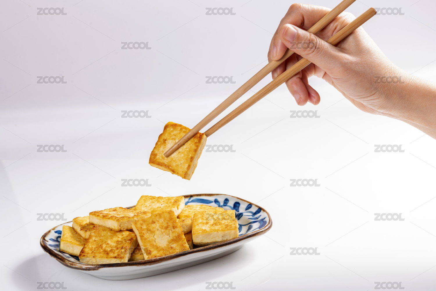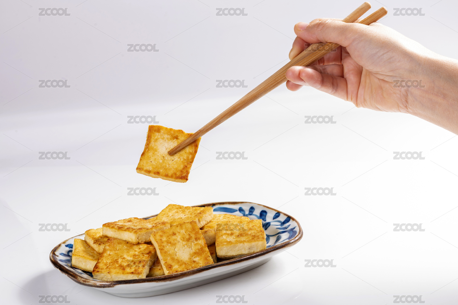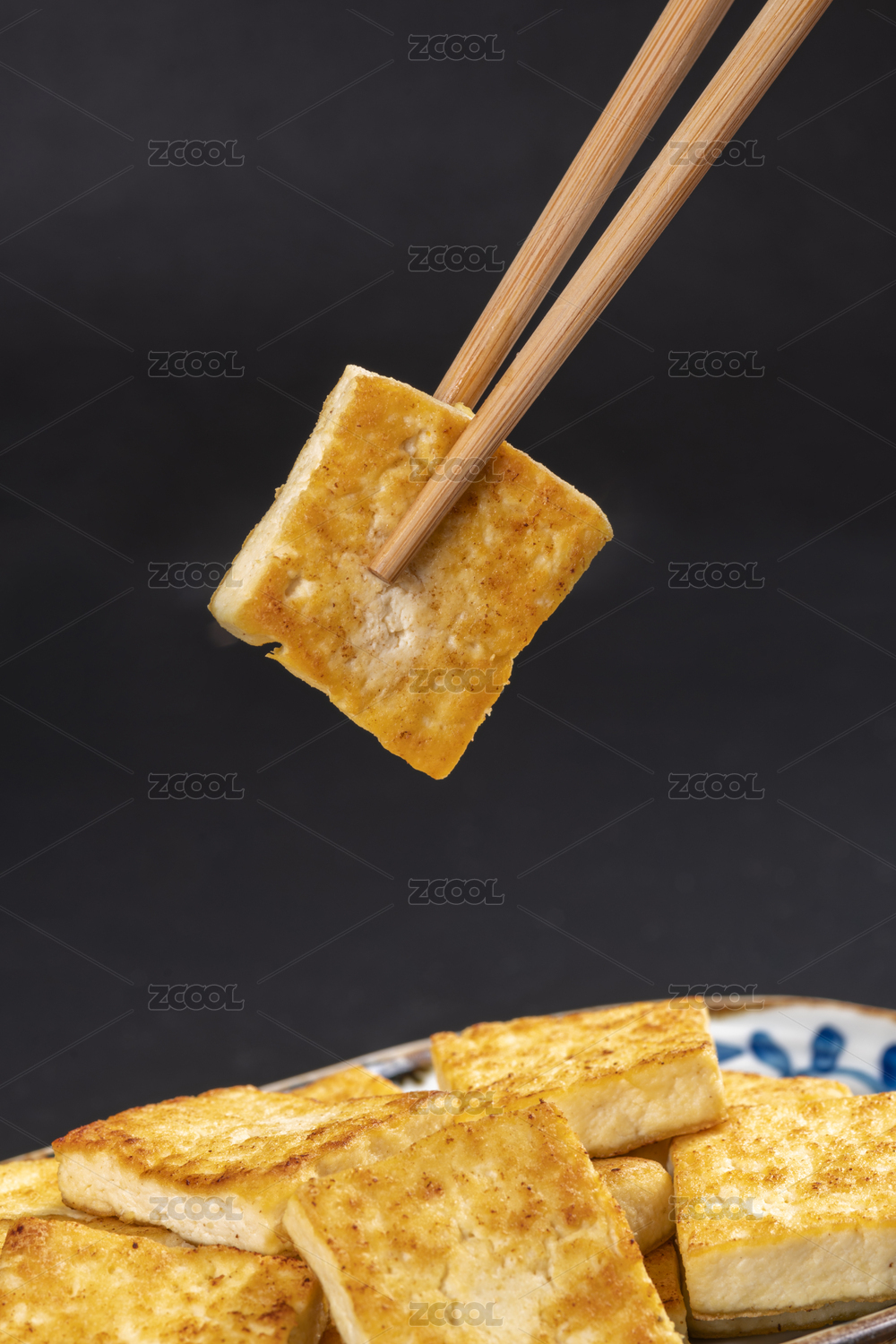 煎豆腐炸豆腐盛放在青花盤(pán)子中擺放在桌面上
