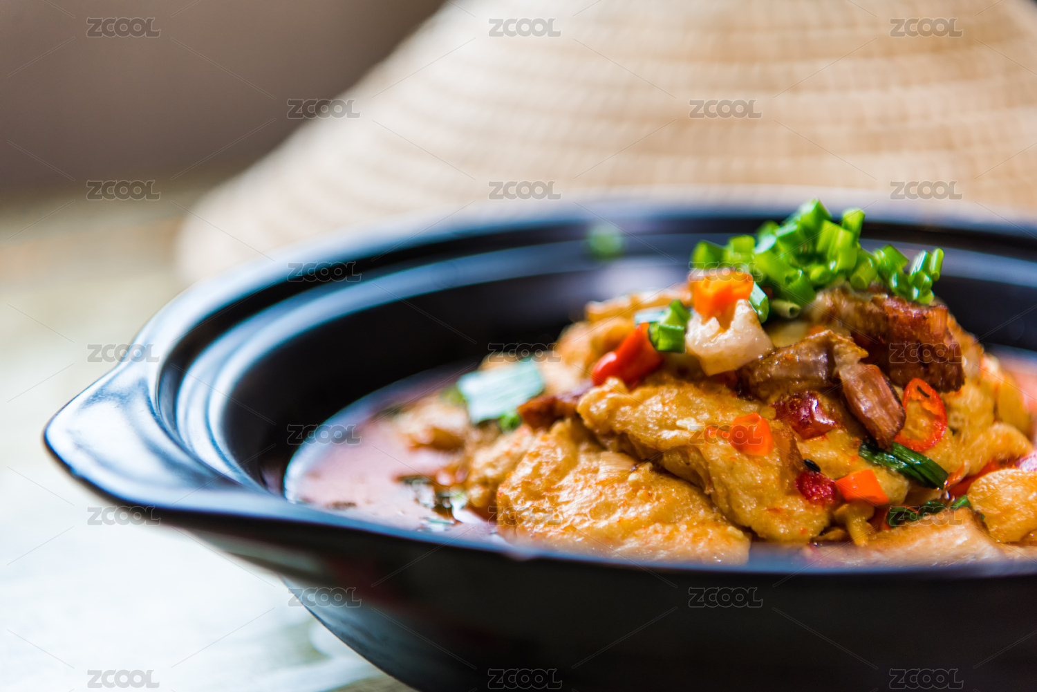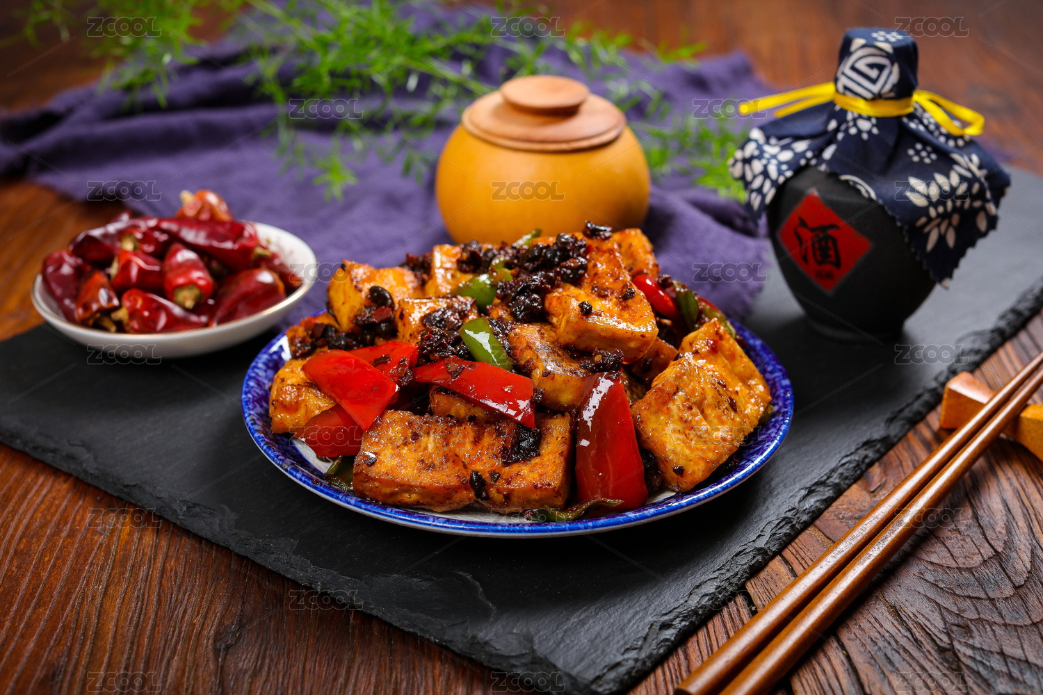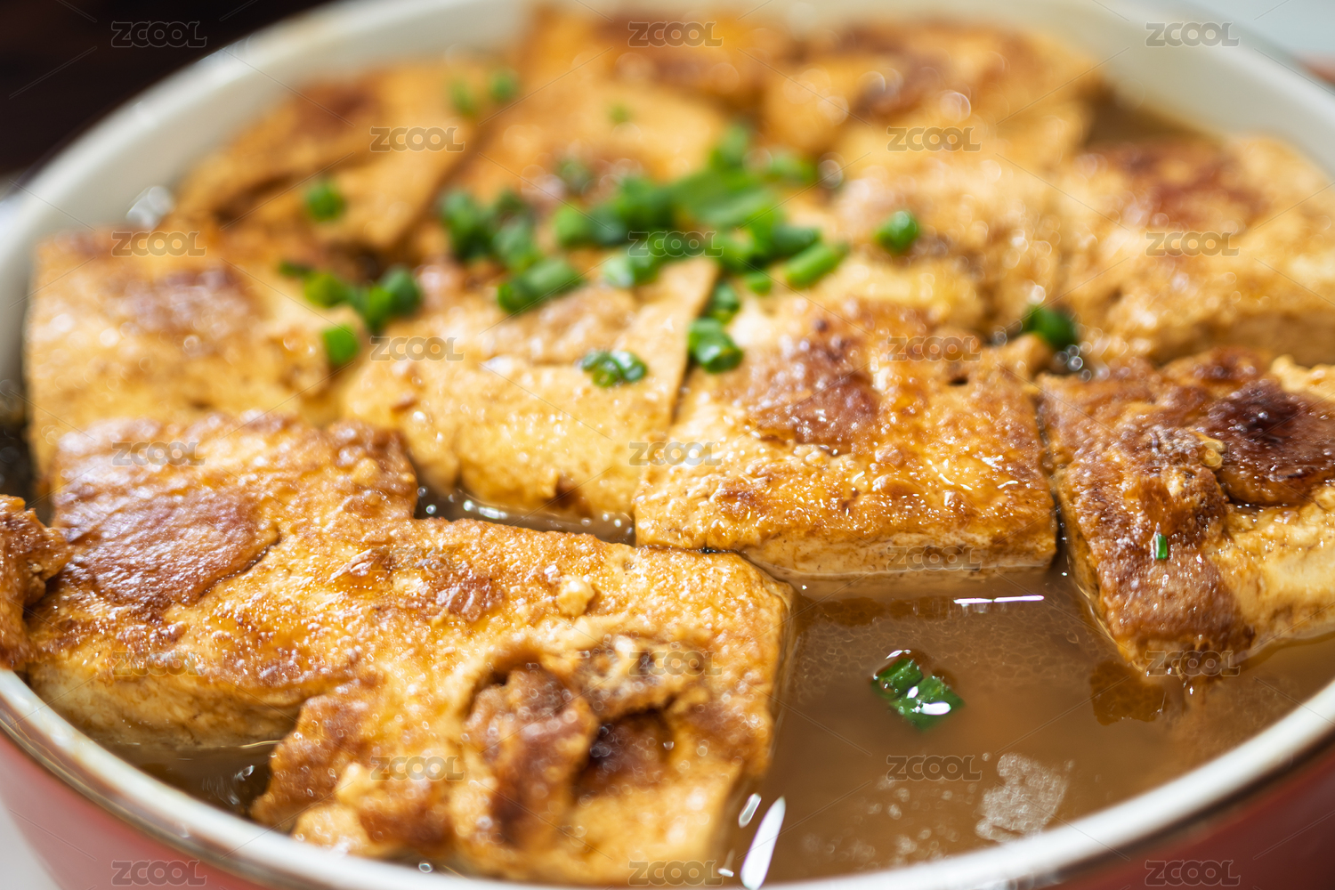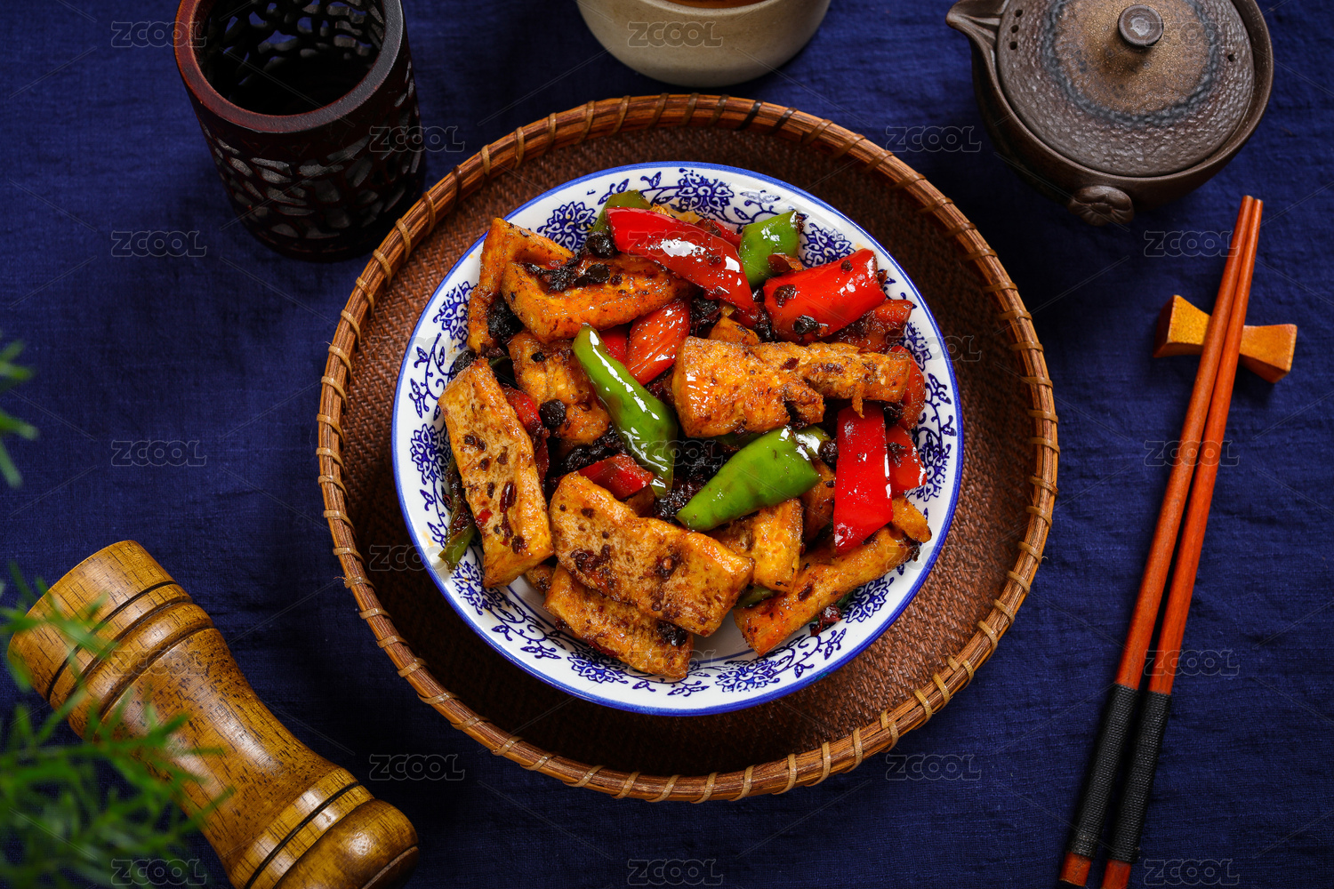 煎豆腐炸豆腐盛放在青花盤(pán)子中擺放在桌面上