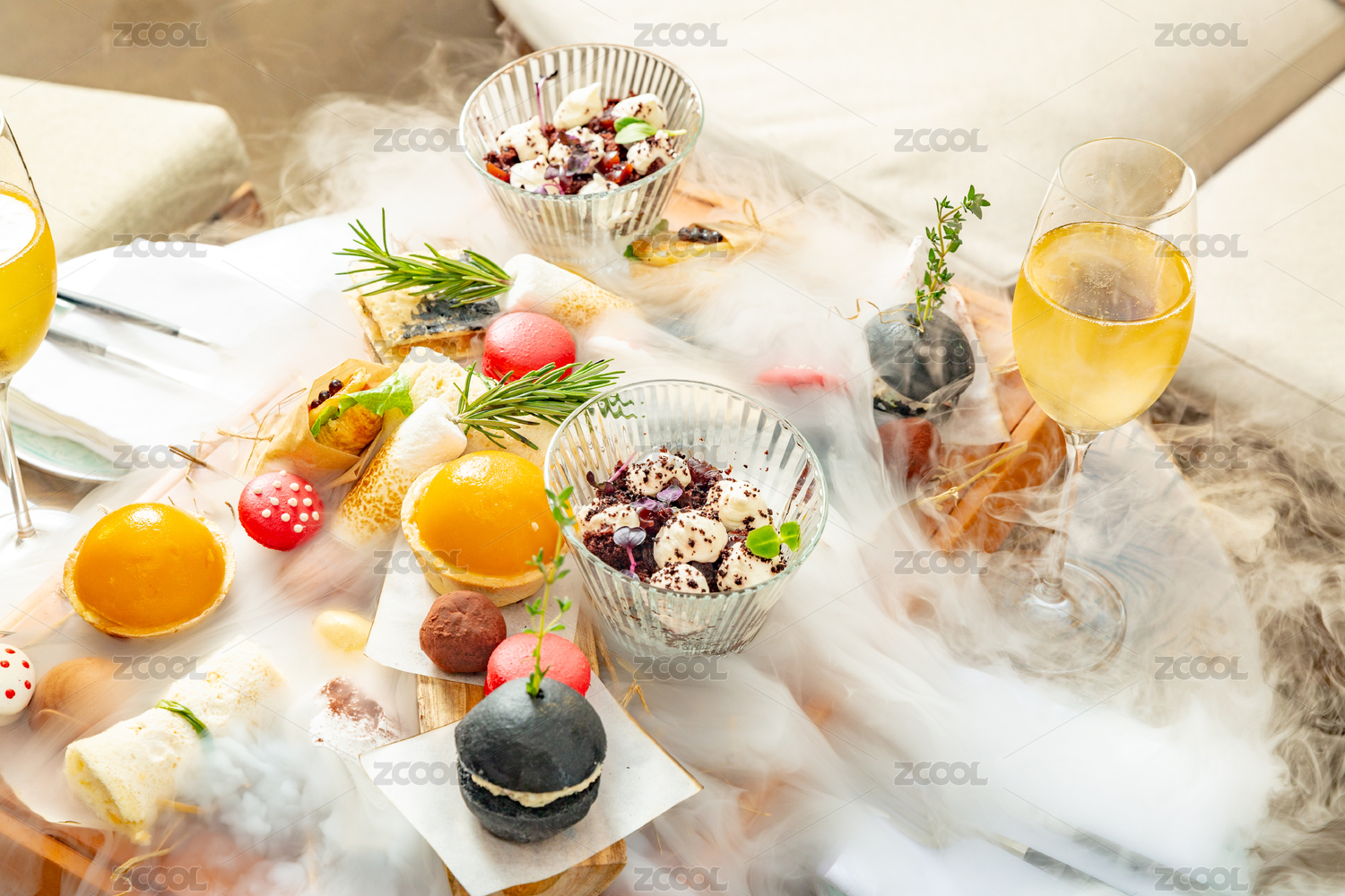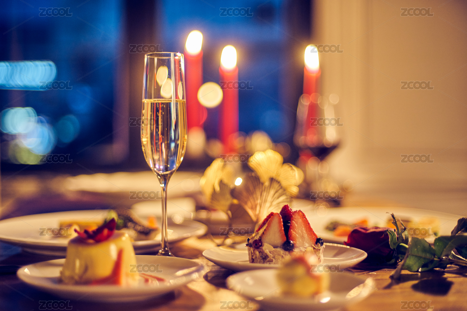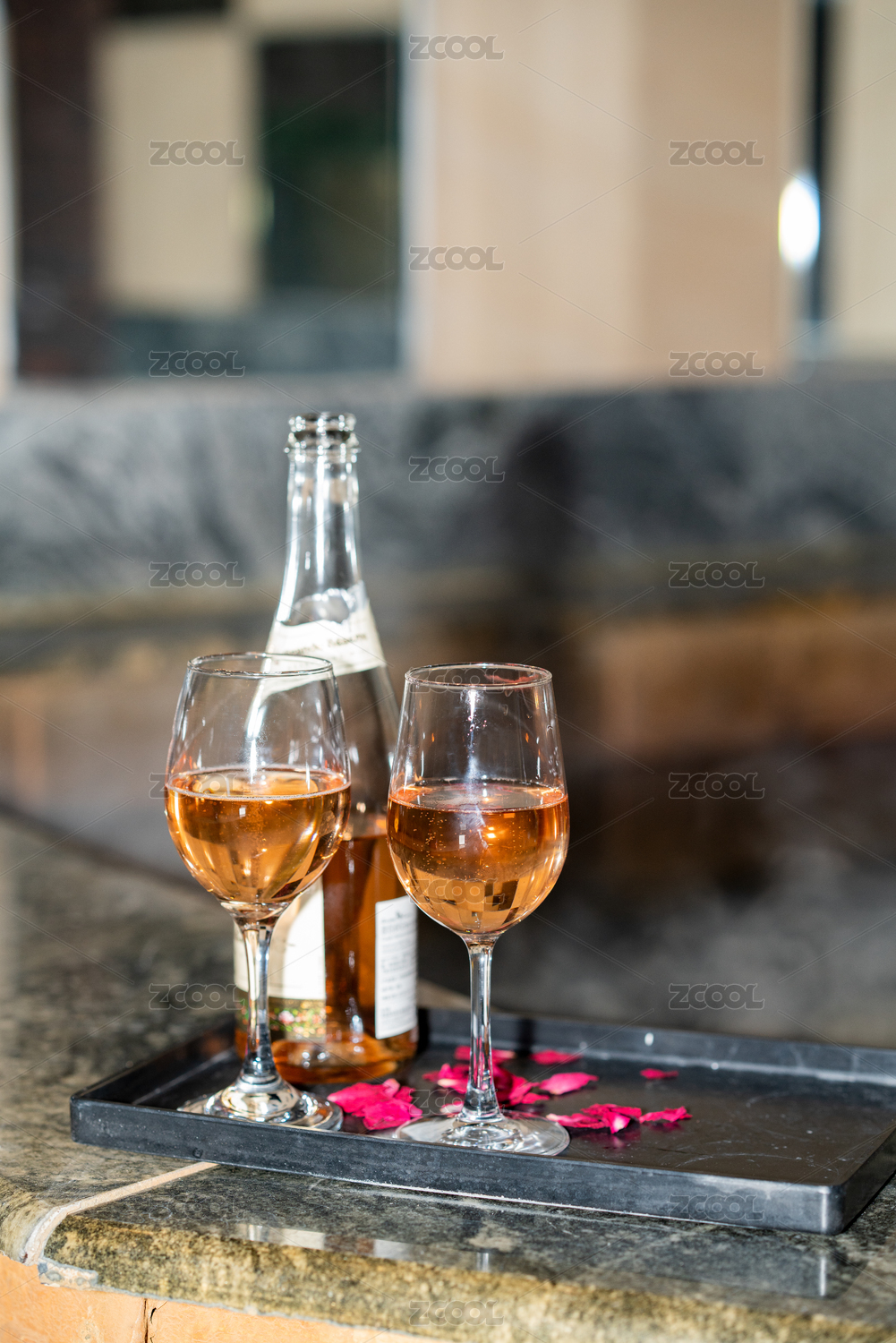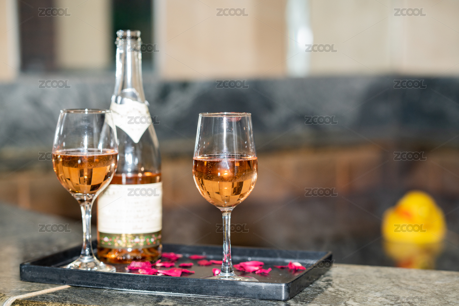 溫泉旁邊放著高腳杯香檳享受酒店提供的服務(wù)
