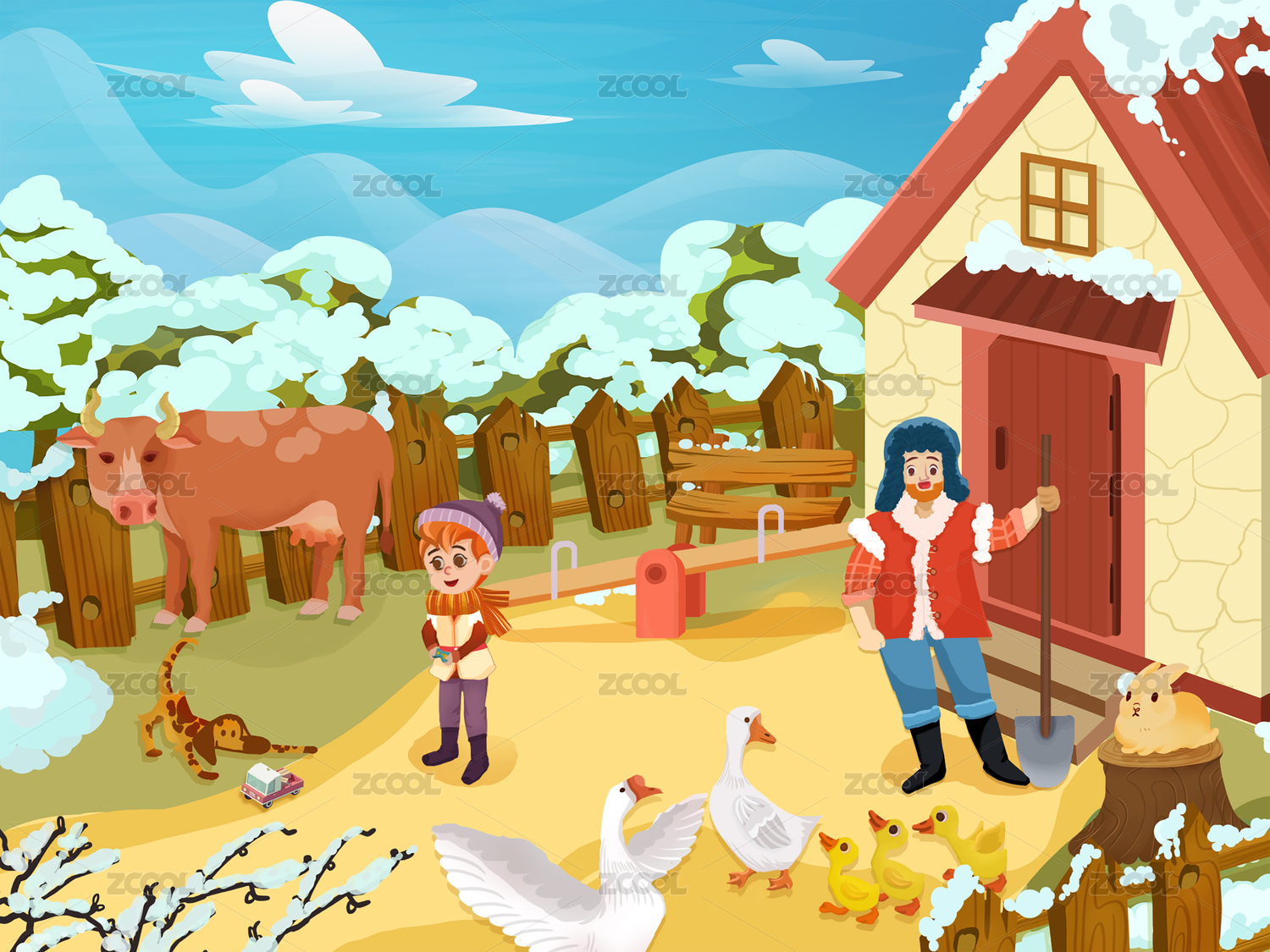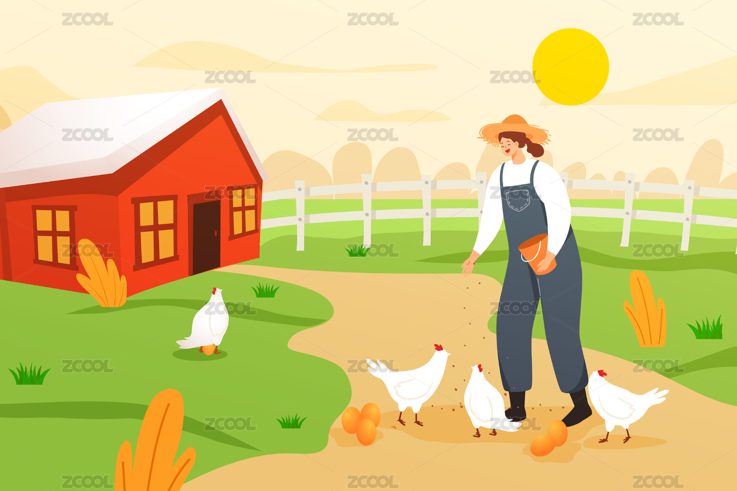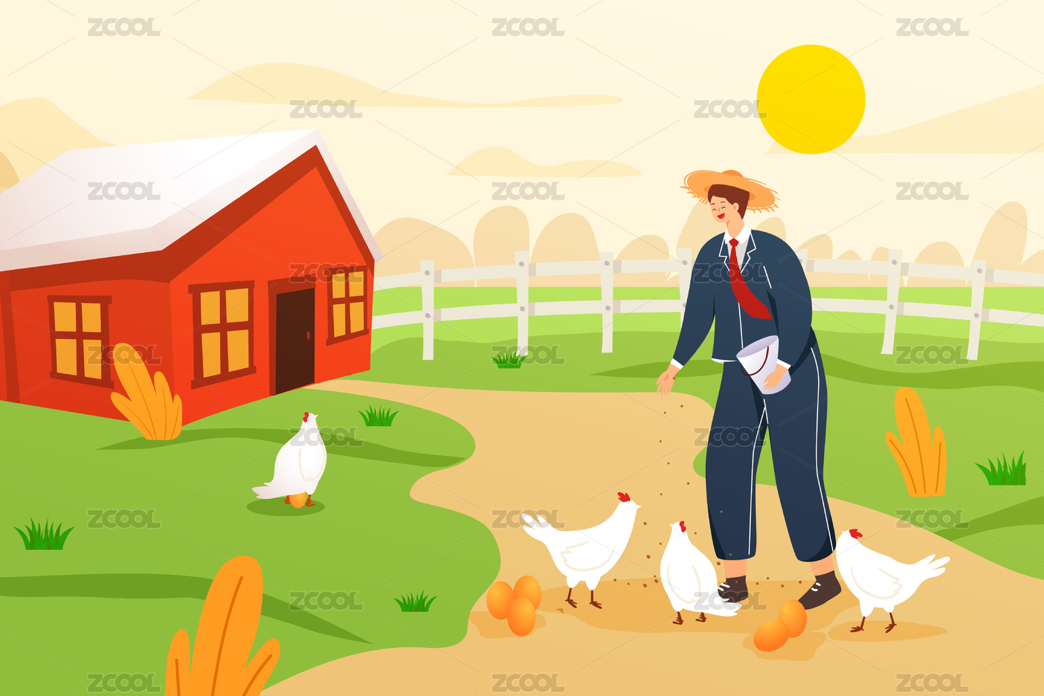 卡通農(nóng)場商人養(yǎng)雞活動(dòng)風(fēng)景背景矢量插畫
