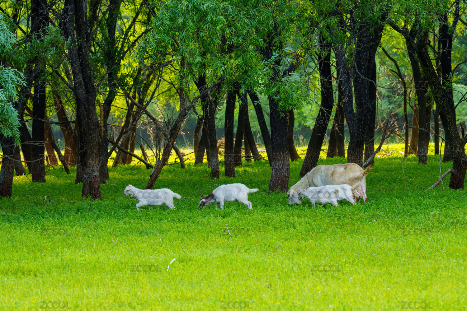 柳樹林綠地覓食的一群山羊