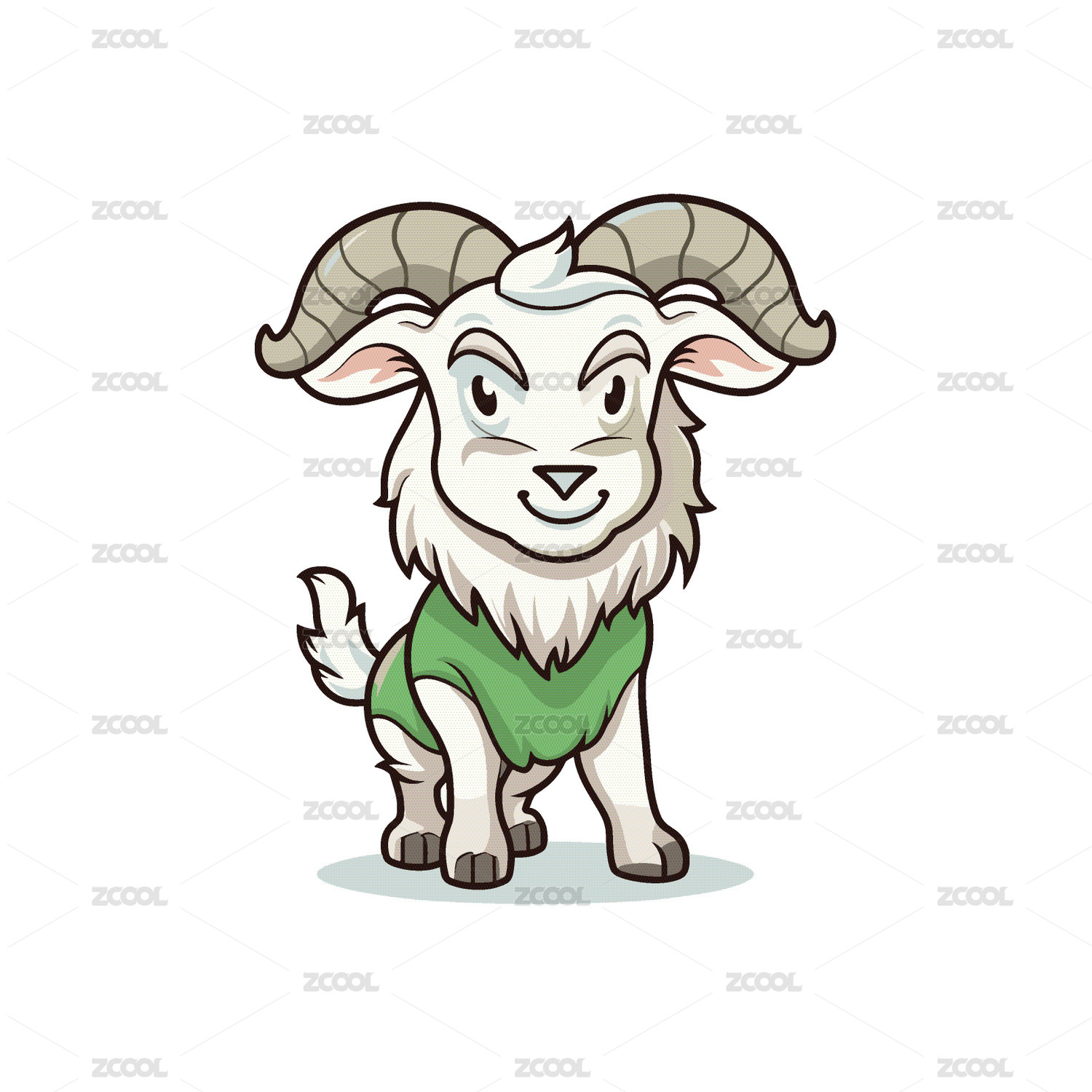可愛的卡通山羊穿著綠色T恤在白色背景上