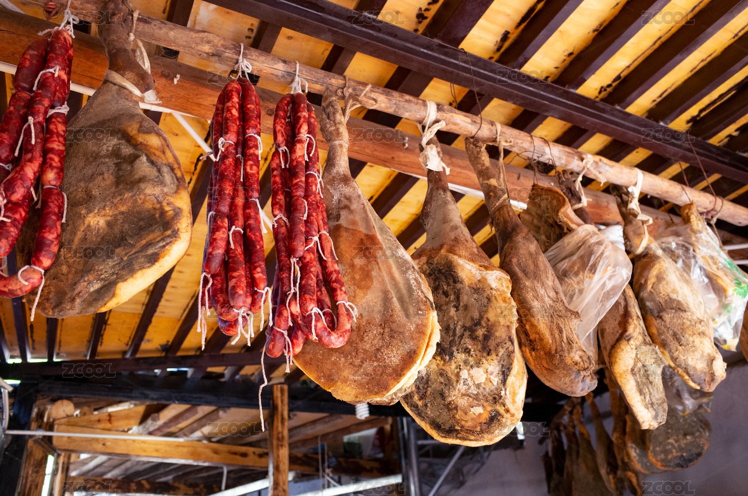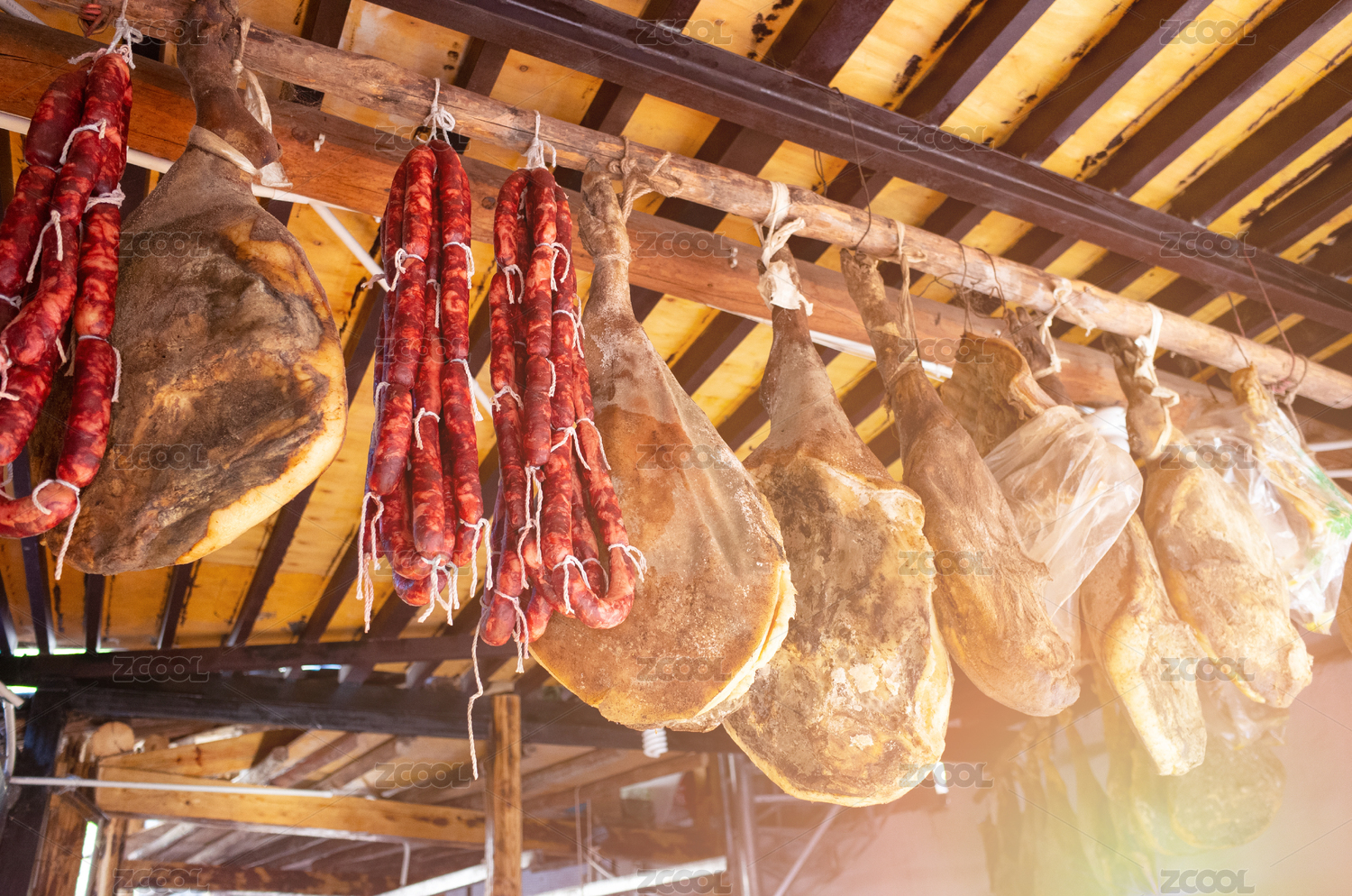 云南大理諾鄧古村村民家房梁上掛著過(guò)年熏制的臘腸臘肉和火腿