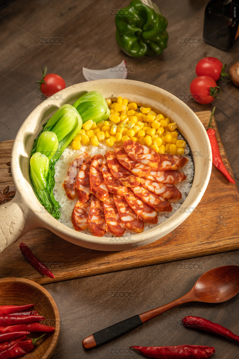 棕色木紋桌上放著一碗香辣臘腸煲仔飯