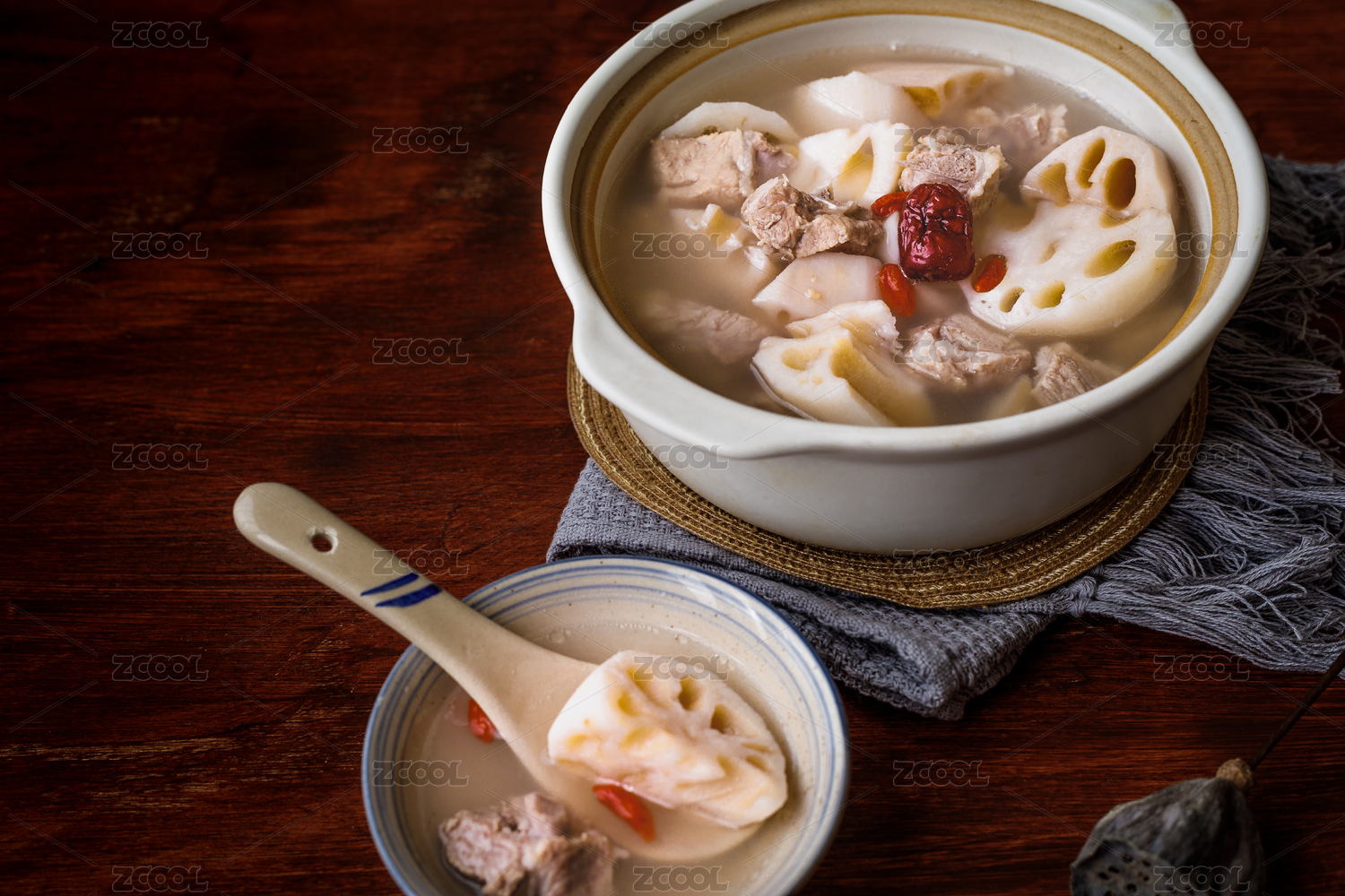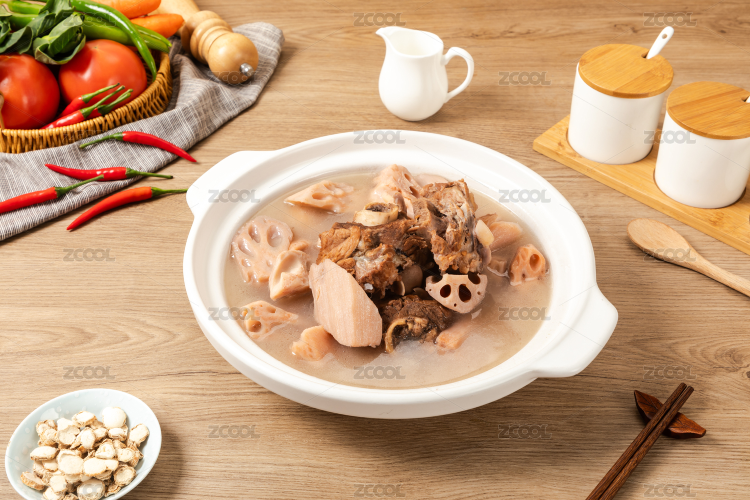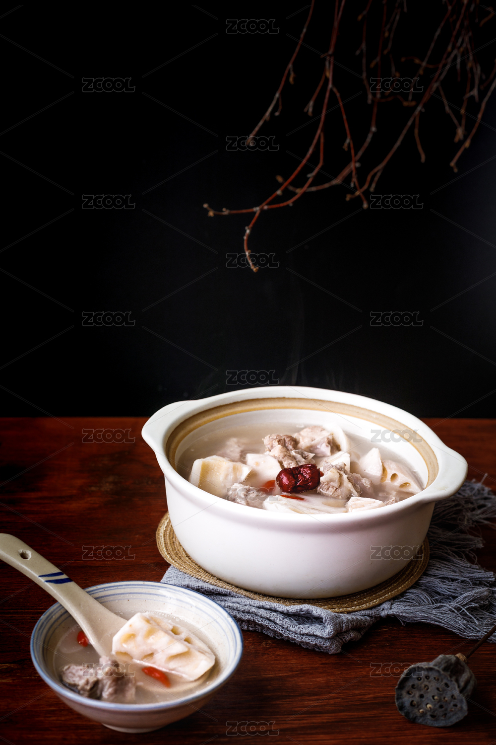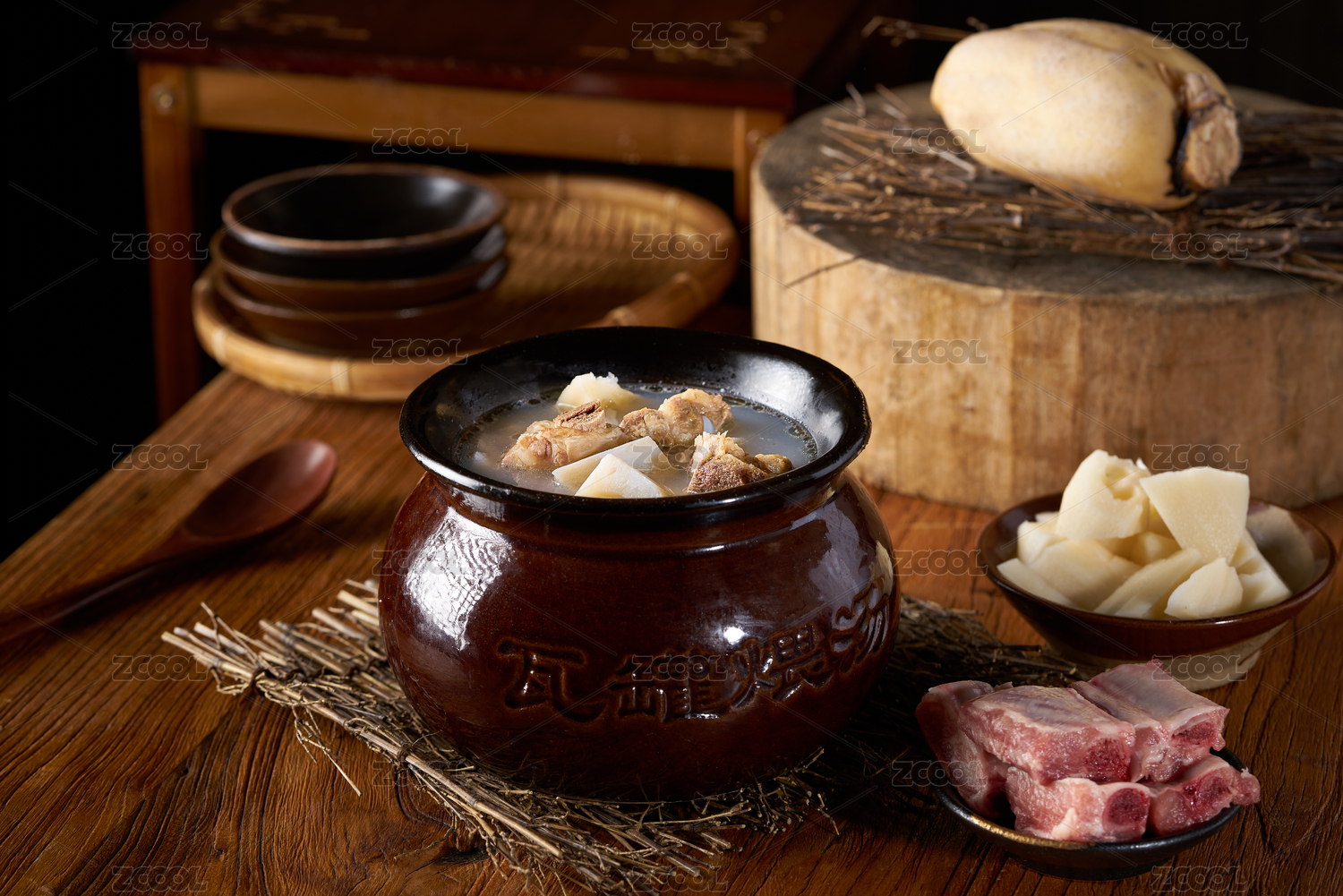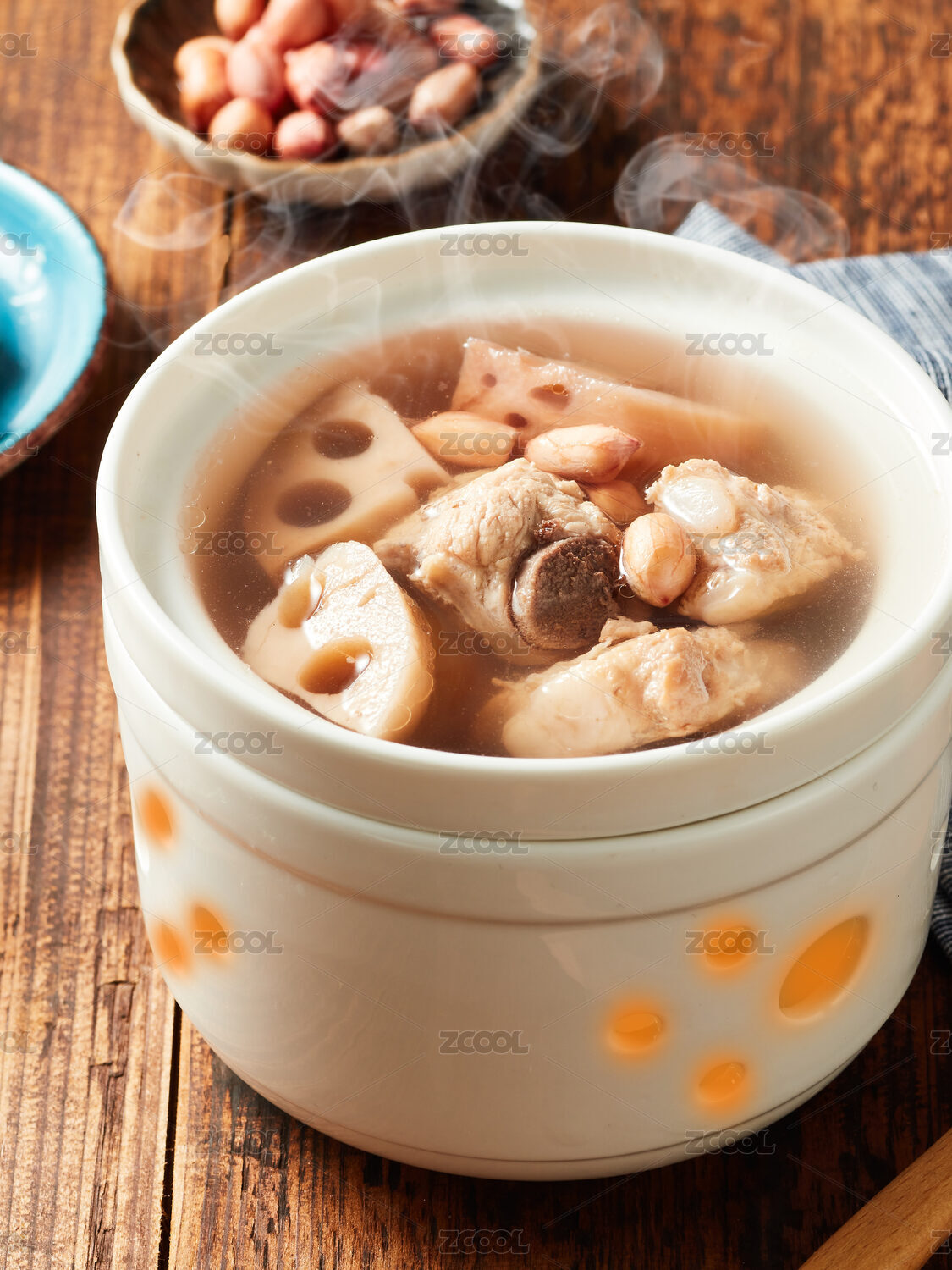 放在砂鍋和瓷碗里的中國蓮藕排骨湯特寫