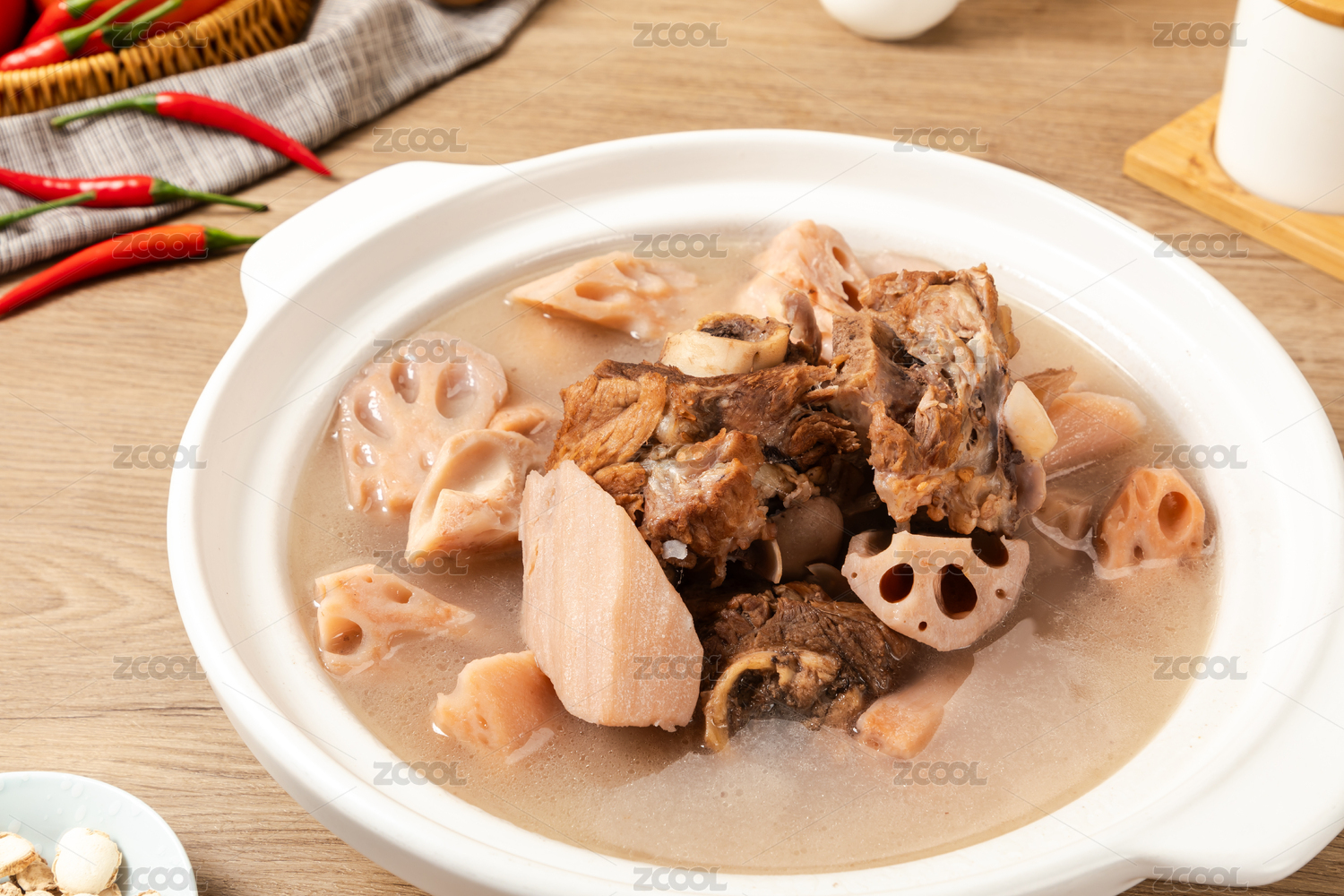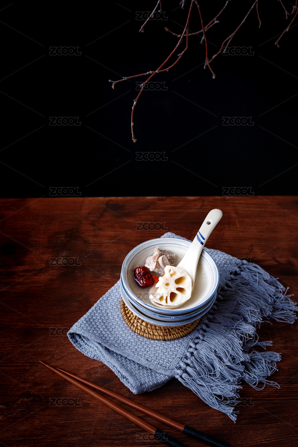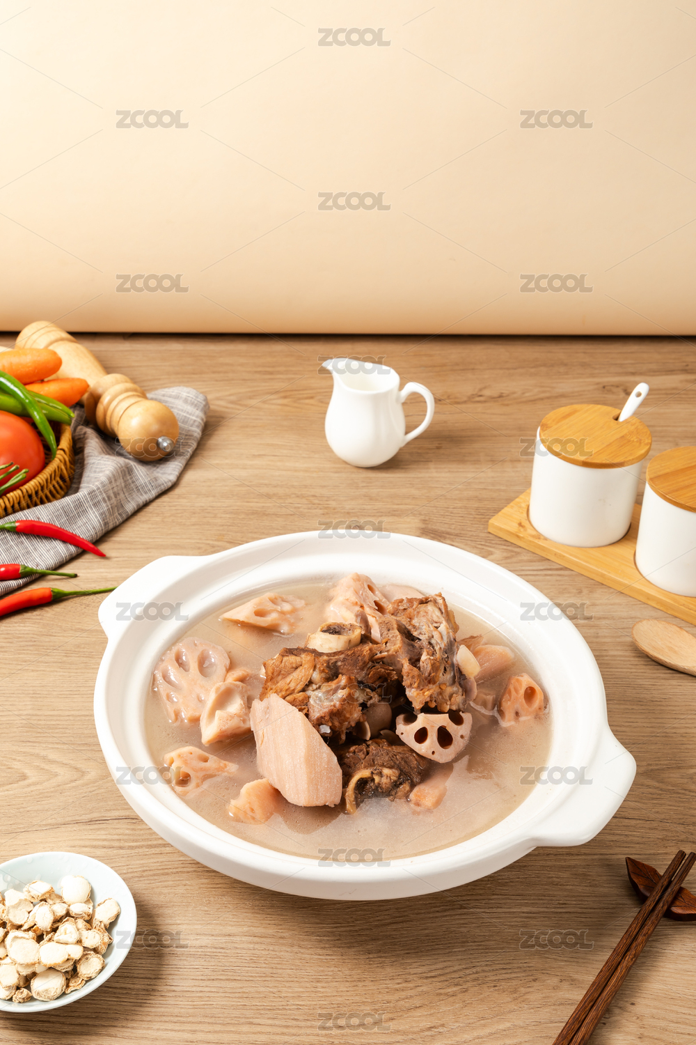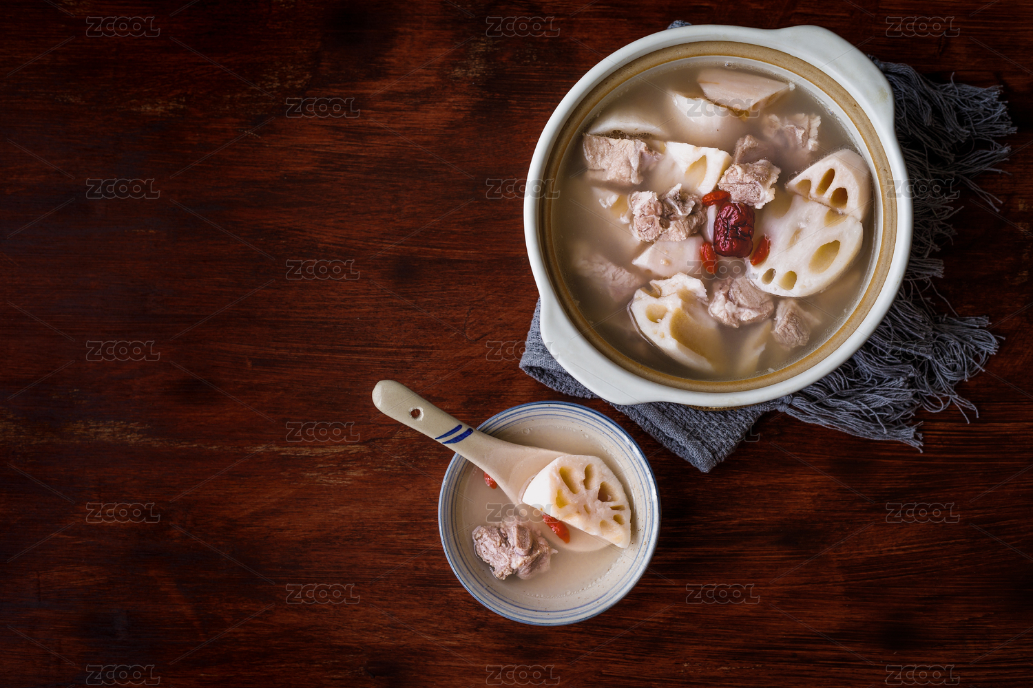 放在砂鍋和瓷碗里的中國蓮藕排骨湯特寫