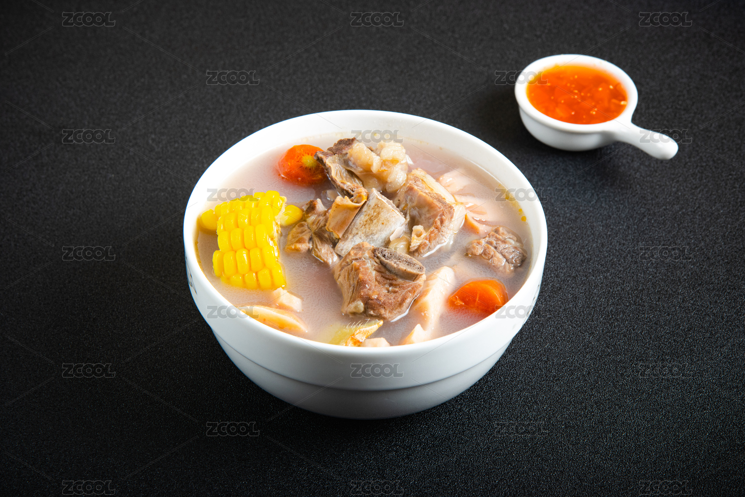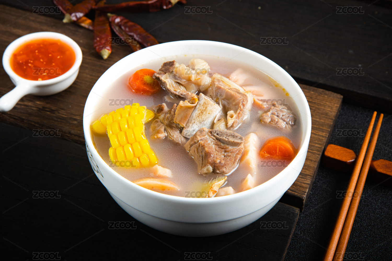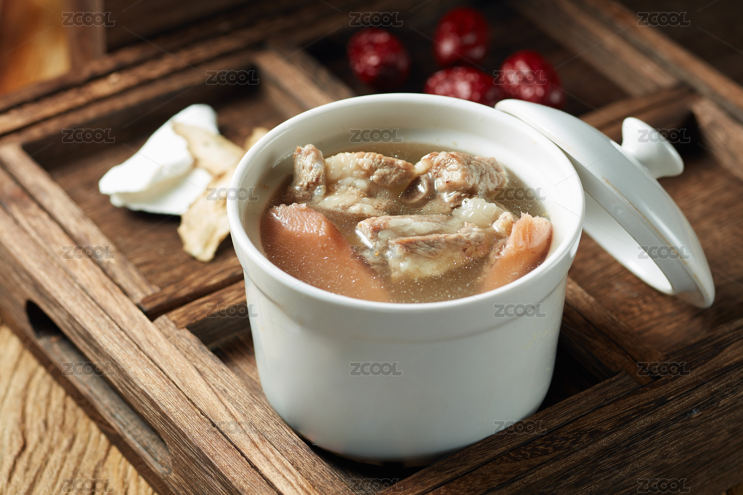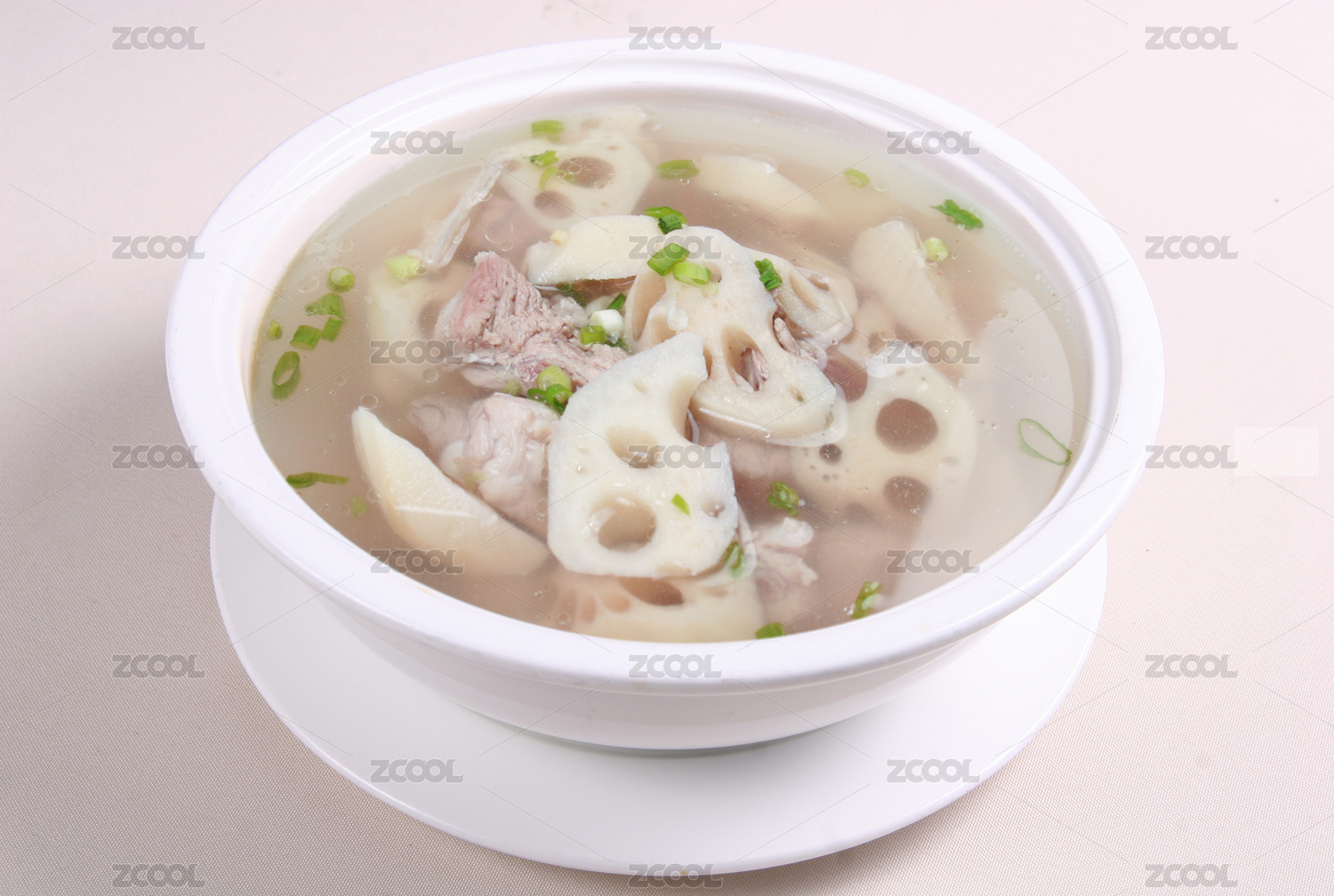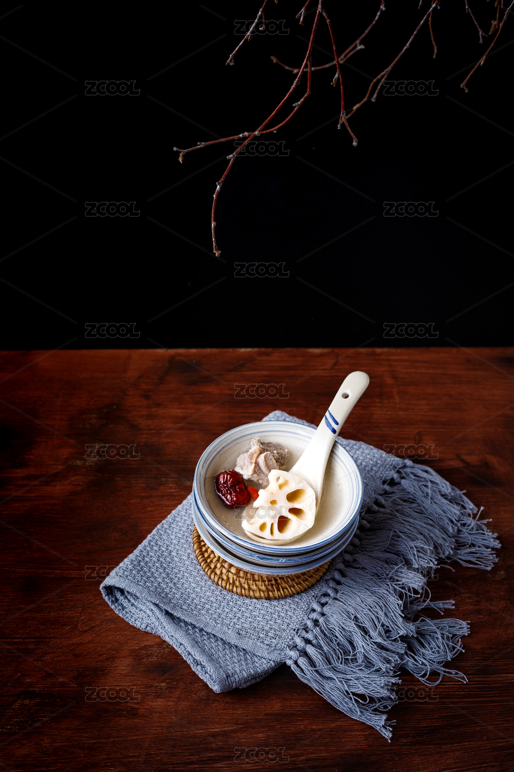放在砂鍋和瓷碗里的中國蓮藕排骨湯特寫