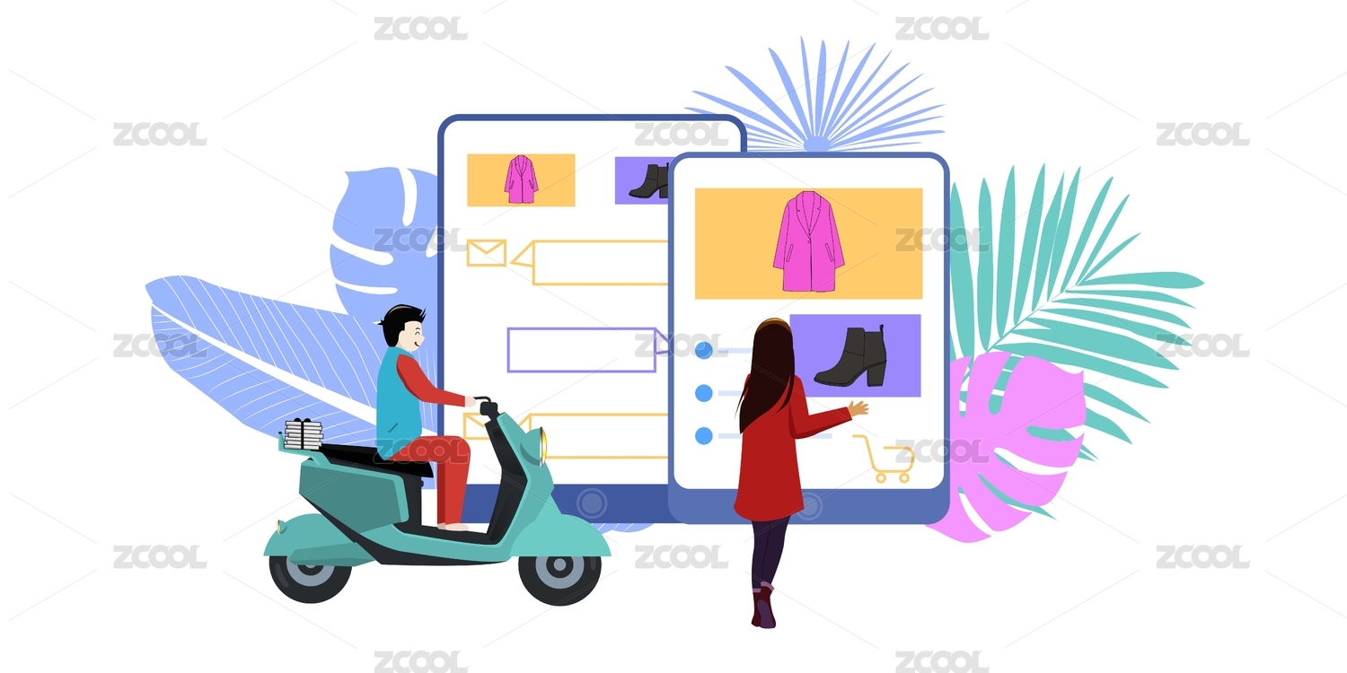 一個女孩站在手機屏幕前網(wǎng)上購物,快遞隨時送達的插畫