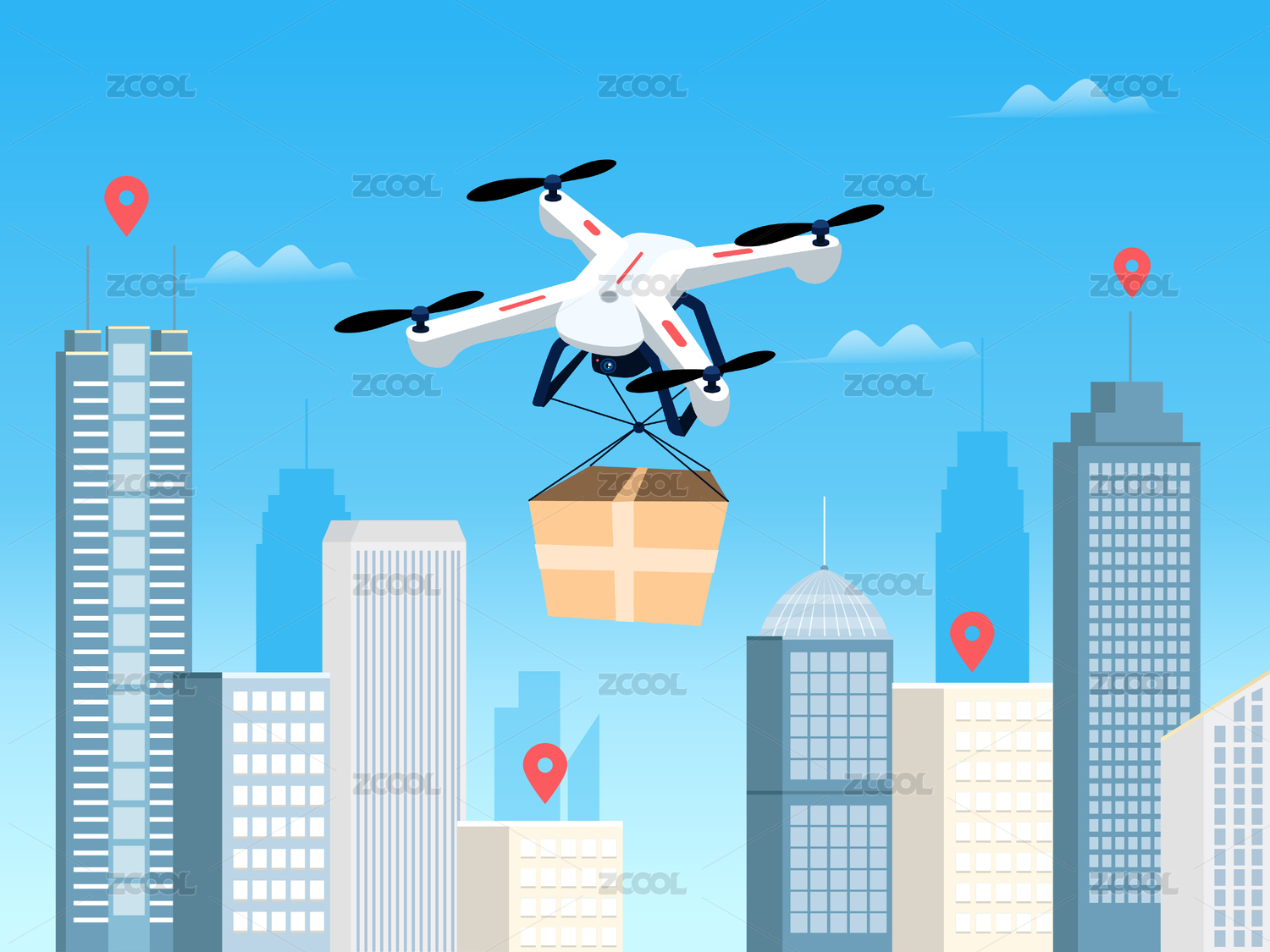 一個無人機正在運輸貨物下面是城市