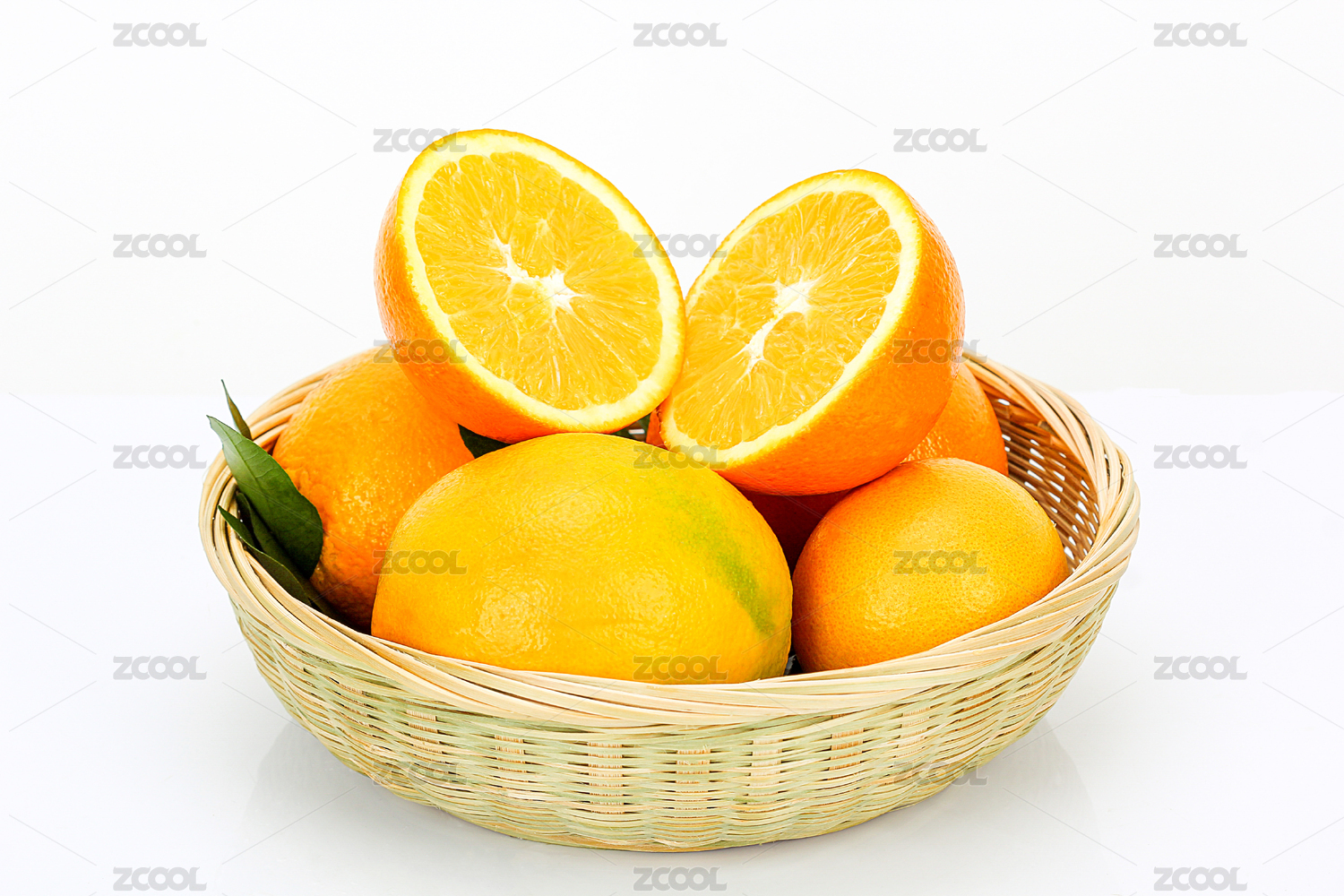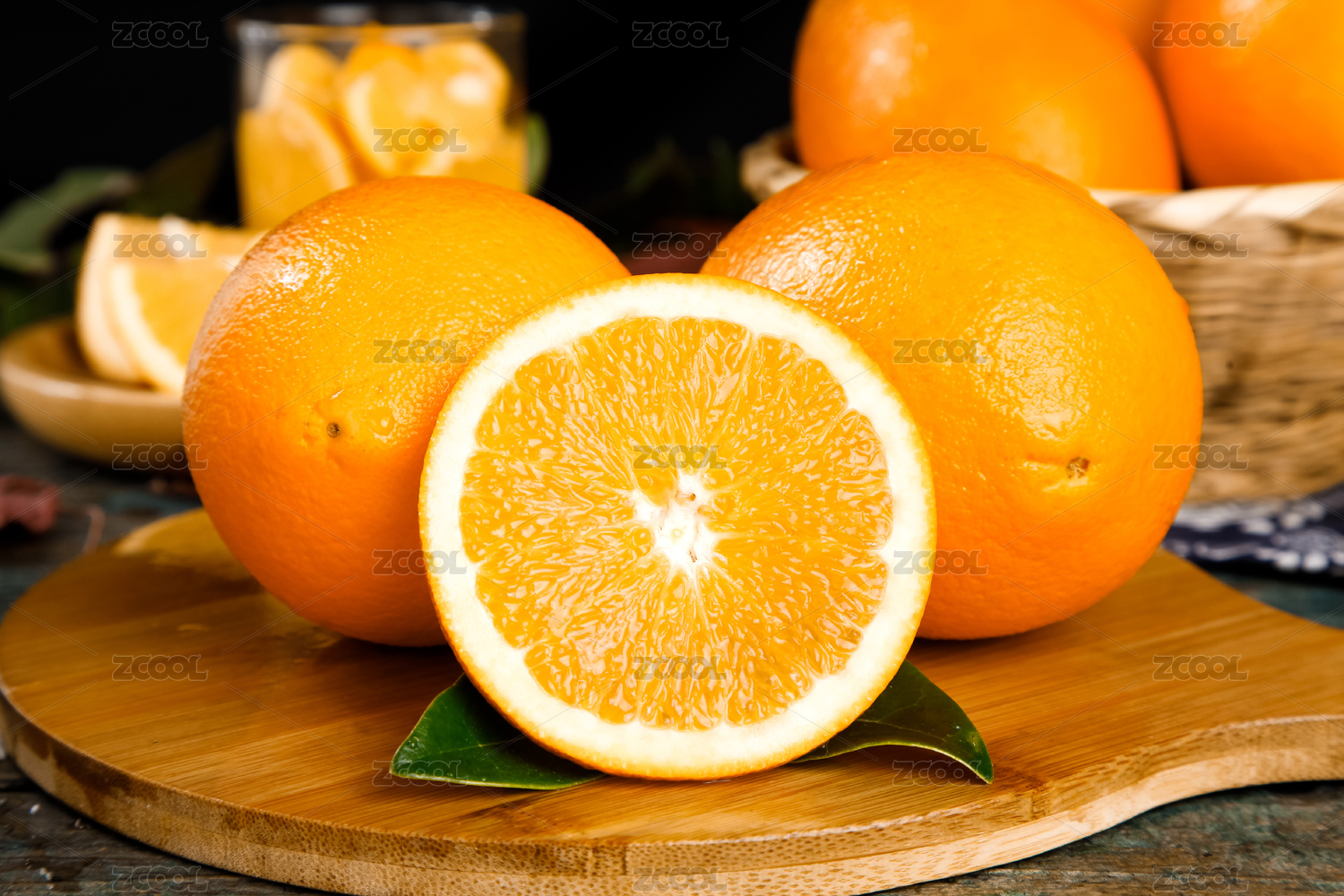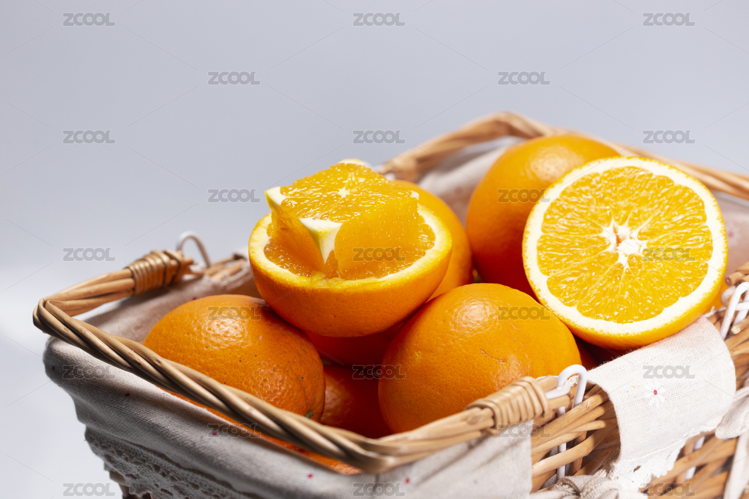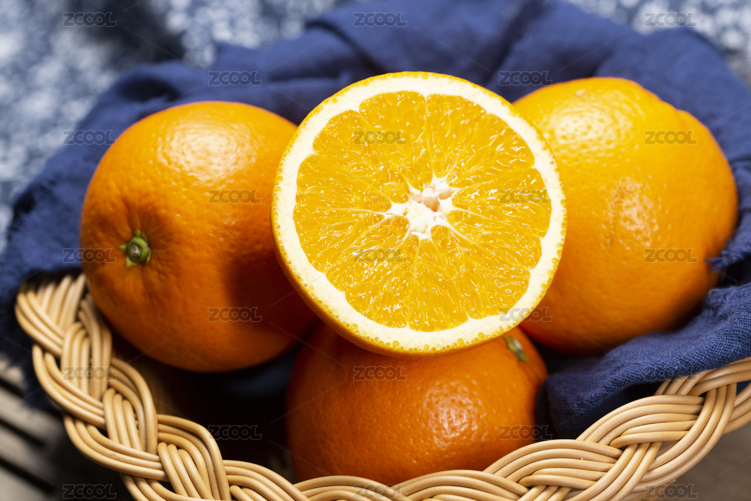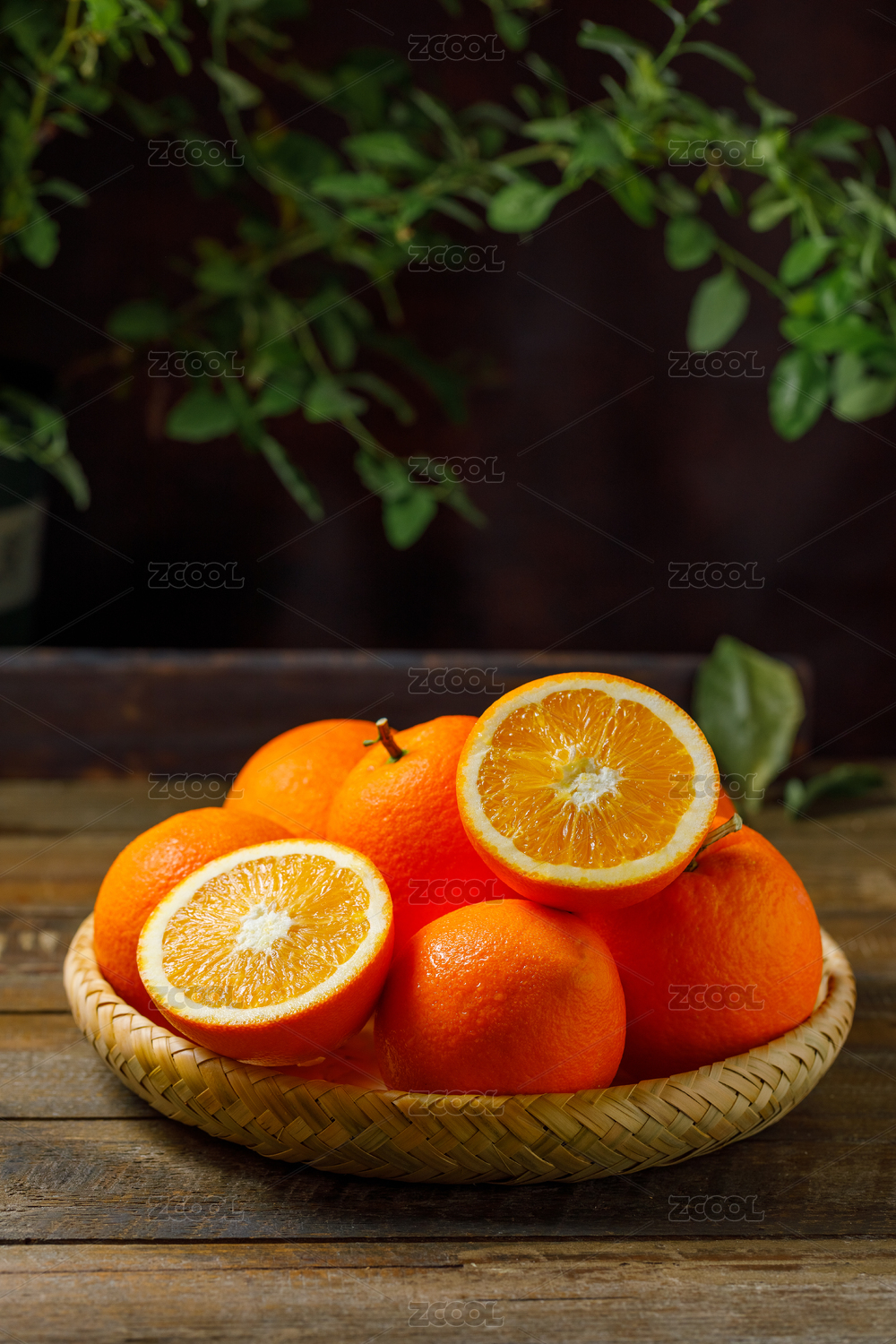 木桌上放在竹筐里的多個(gè)切開的雷波臍橙