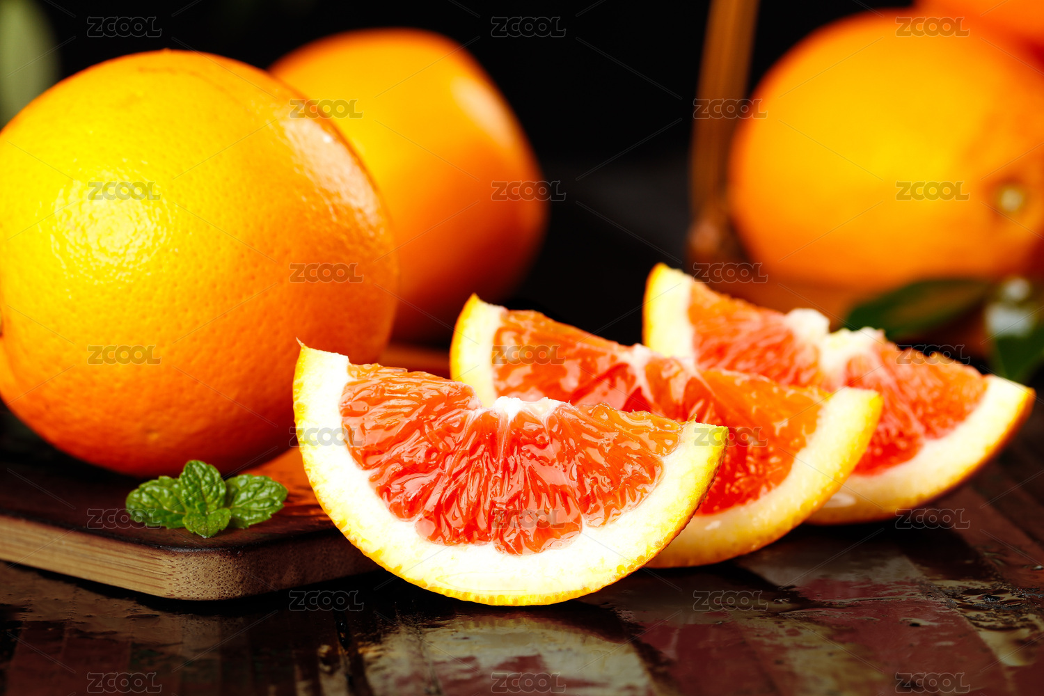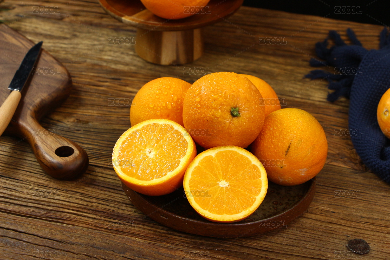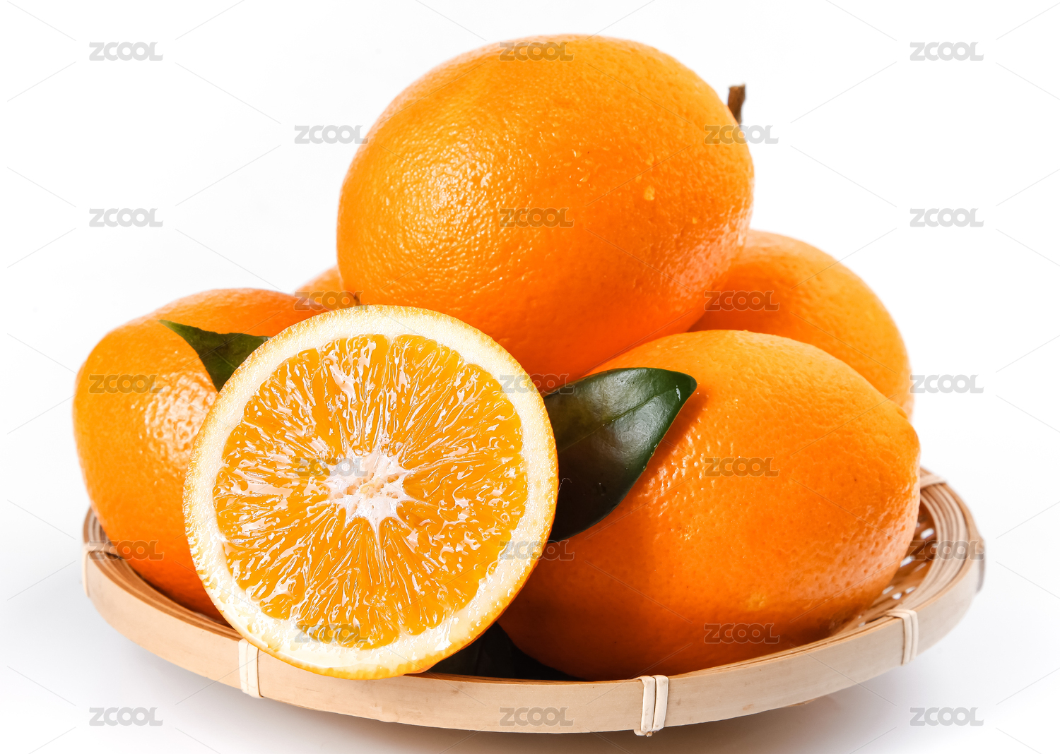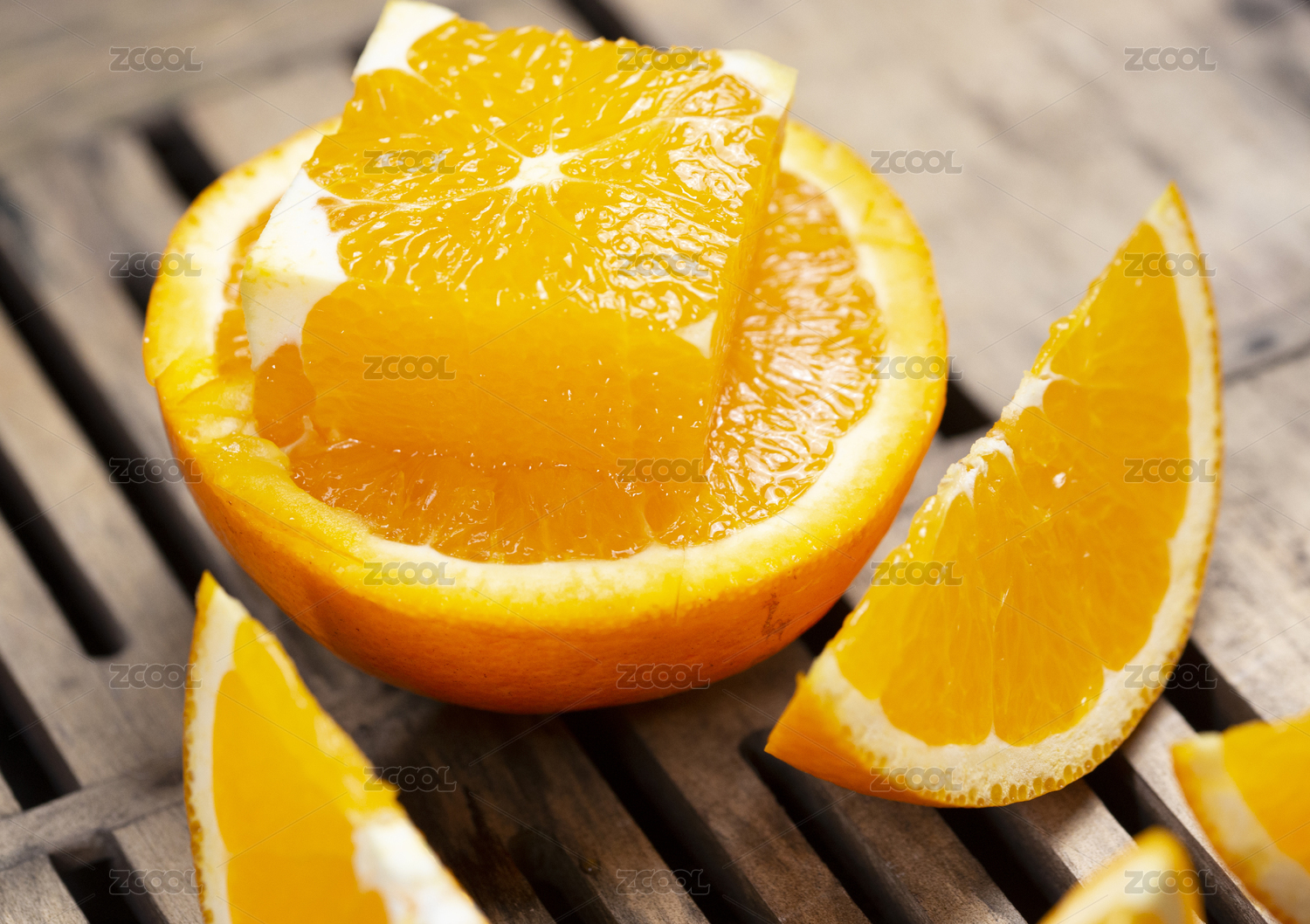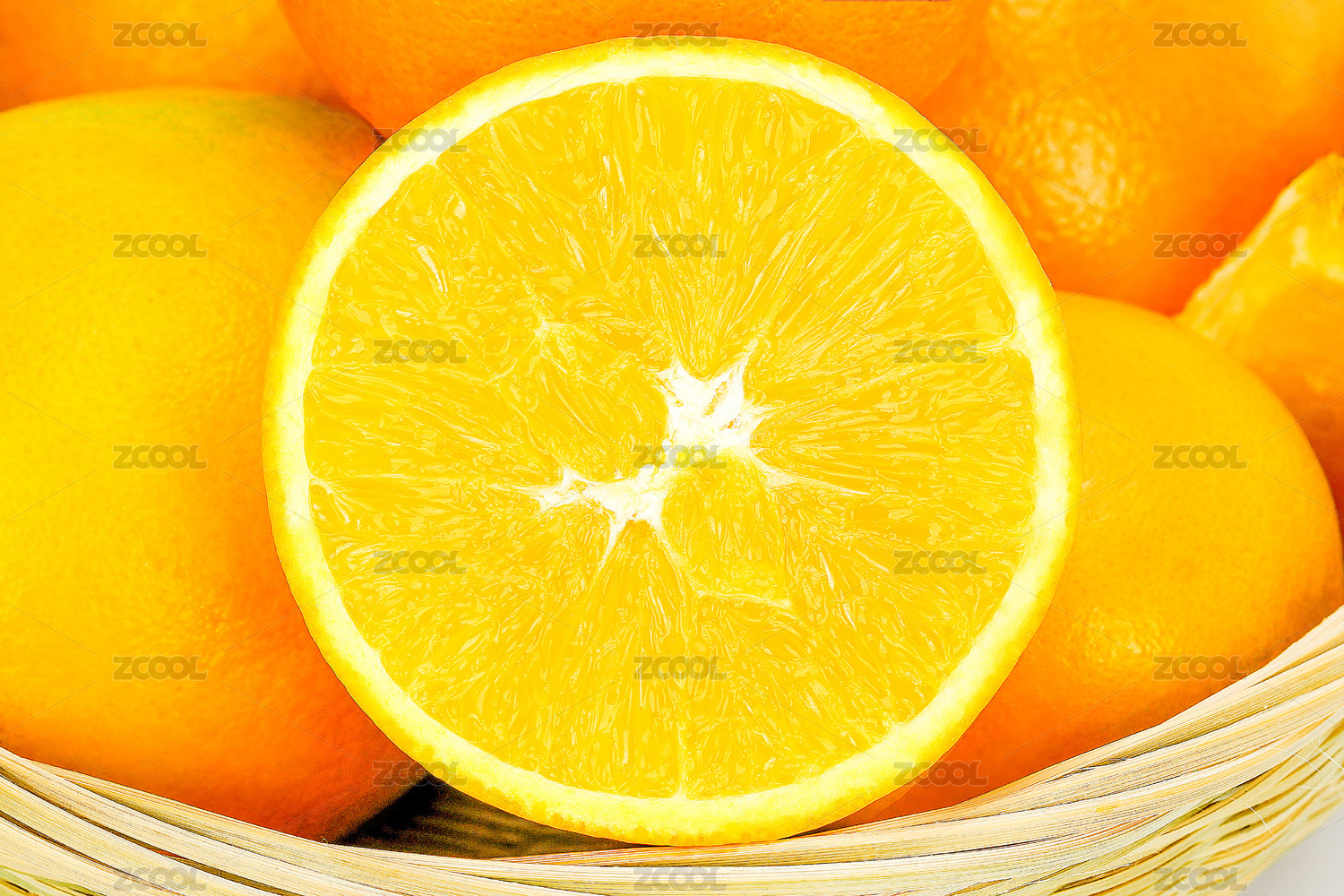 木桌上放在竹筐里的多個(gè)切開的雷波臍橙