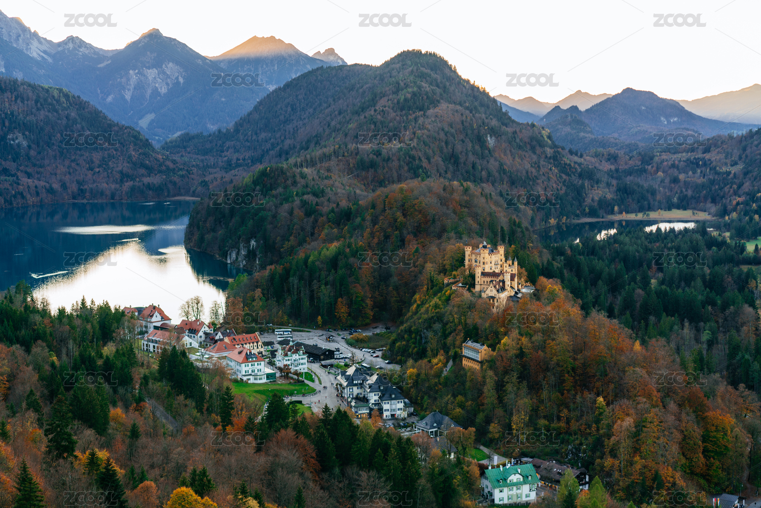 歐洲德國(guó)舊天鵝堡湖泊山脈遠(yuǎn)景