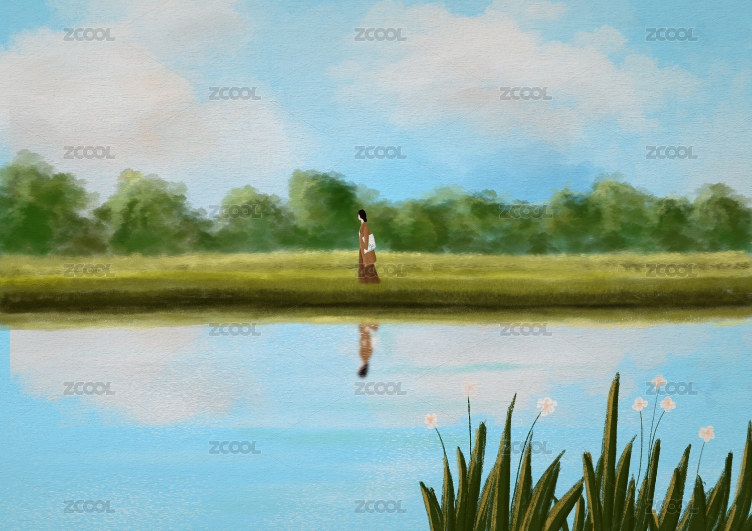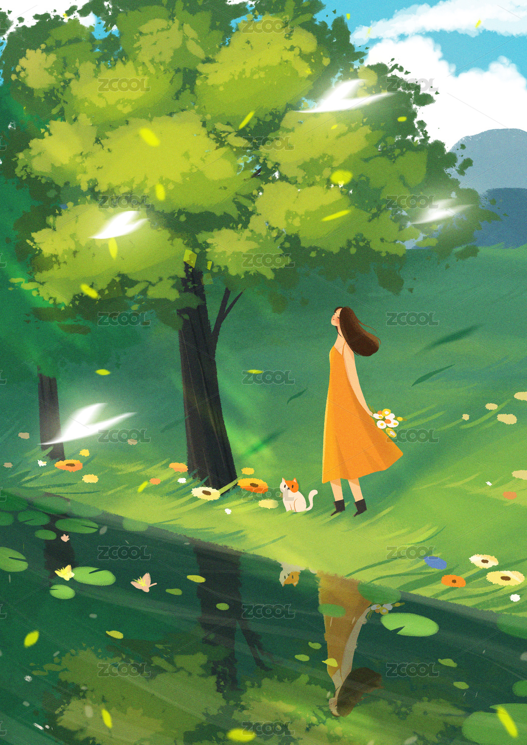 原創(chuàng)插畫(huà) 四季插畫(huà) 春夏風(fēng)景在河邊的女孩