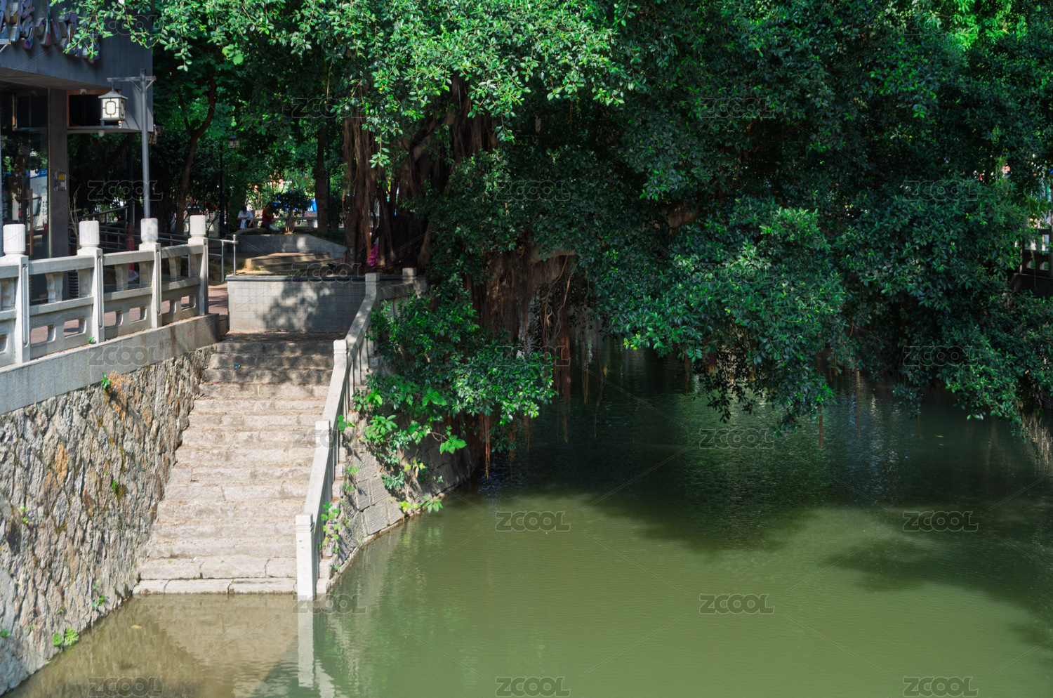 福州上下杭河邊石梯與繁茂綠樹(shù)景致