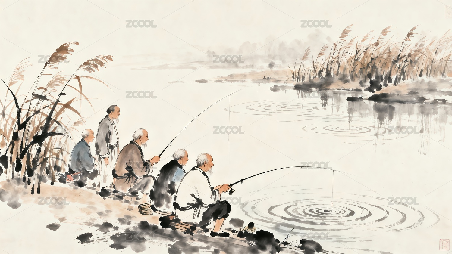 重陽(yáng)節(jié)一群老人在河邊垂釣水墨風(fēng)格插畫(huà)
