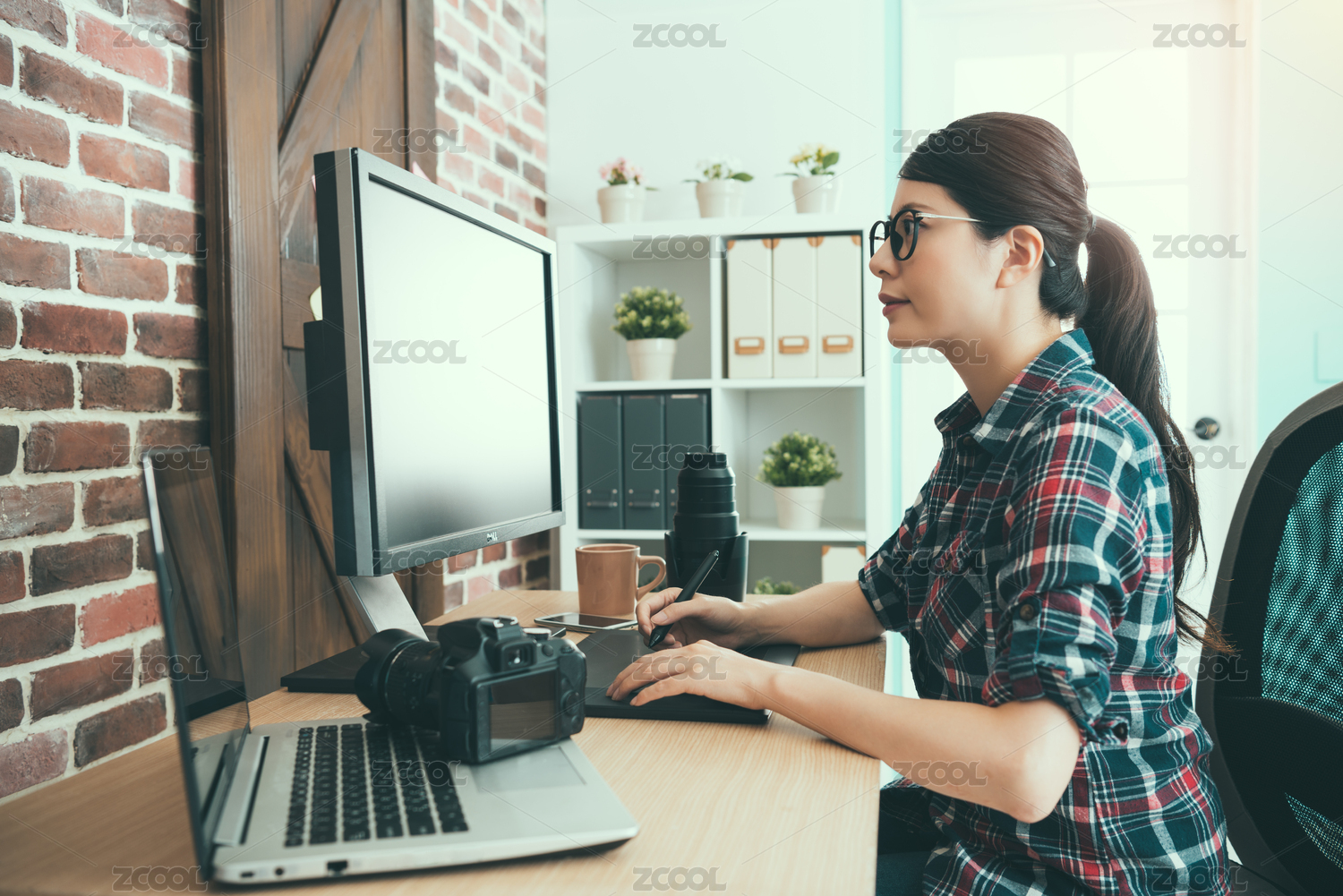 美麗甜蜜的女?dāng)z影師看著電腦審核工作畫面,并使用數(shù)字筆潤飾坐在編輯辦公桌。