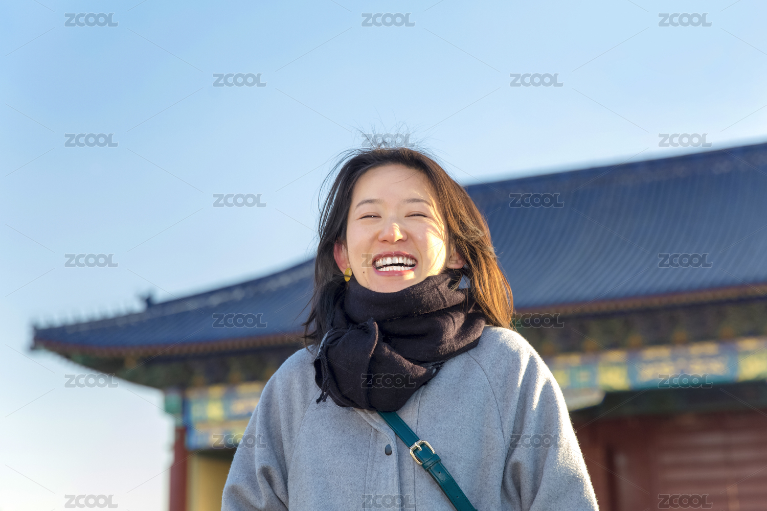 一位在北京旅游的亞裔女人對(duì)著鏡頭開(kāi)心大笑