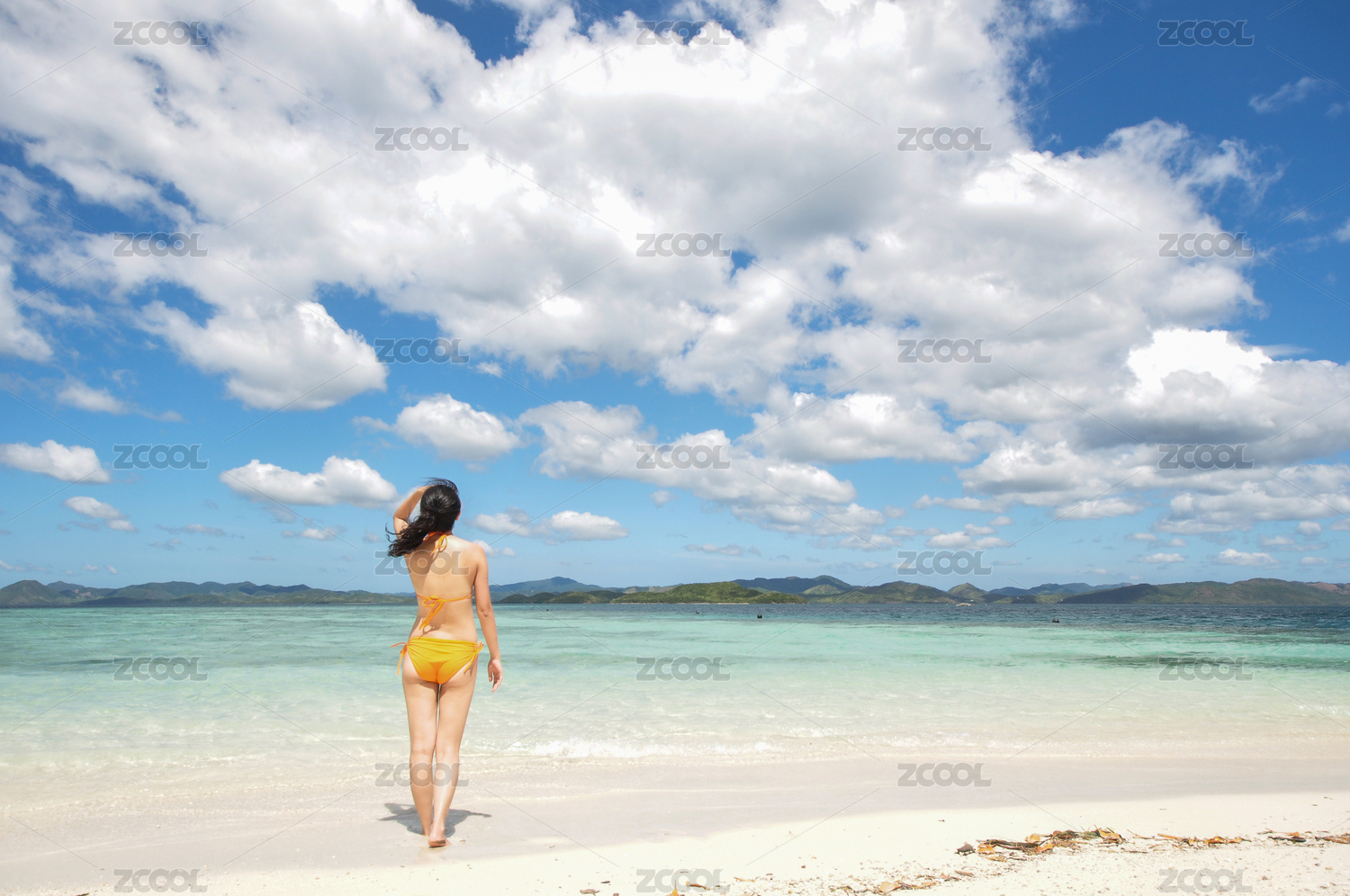站在海灘上的美女背對(duì)鏡頭遠(yuǎn)望遠(yuǎn)處