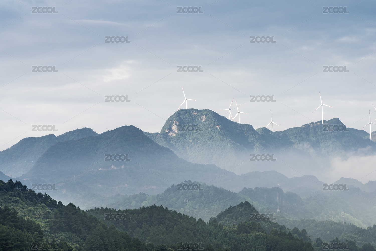 夏季的早晨遠(yuǎn)望重慶市綦江區(qū)萬(wàn)盛莽莽群山中的南天門風(fēng)力發(fā)電站