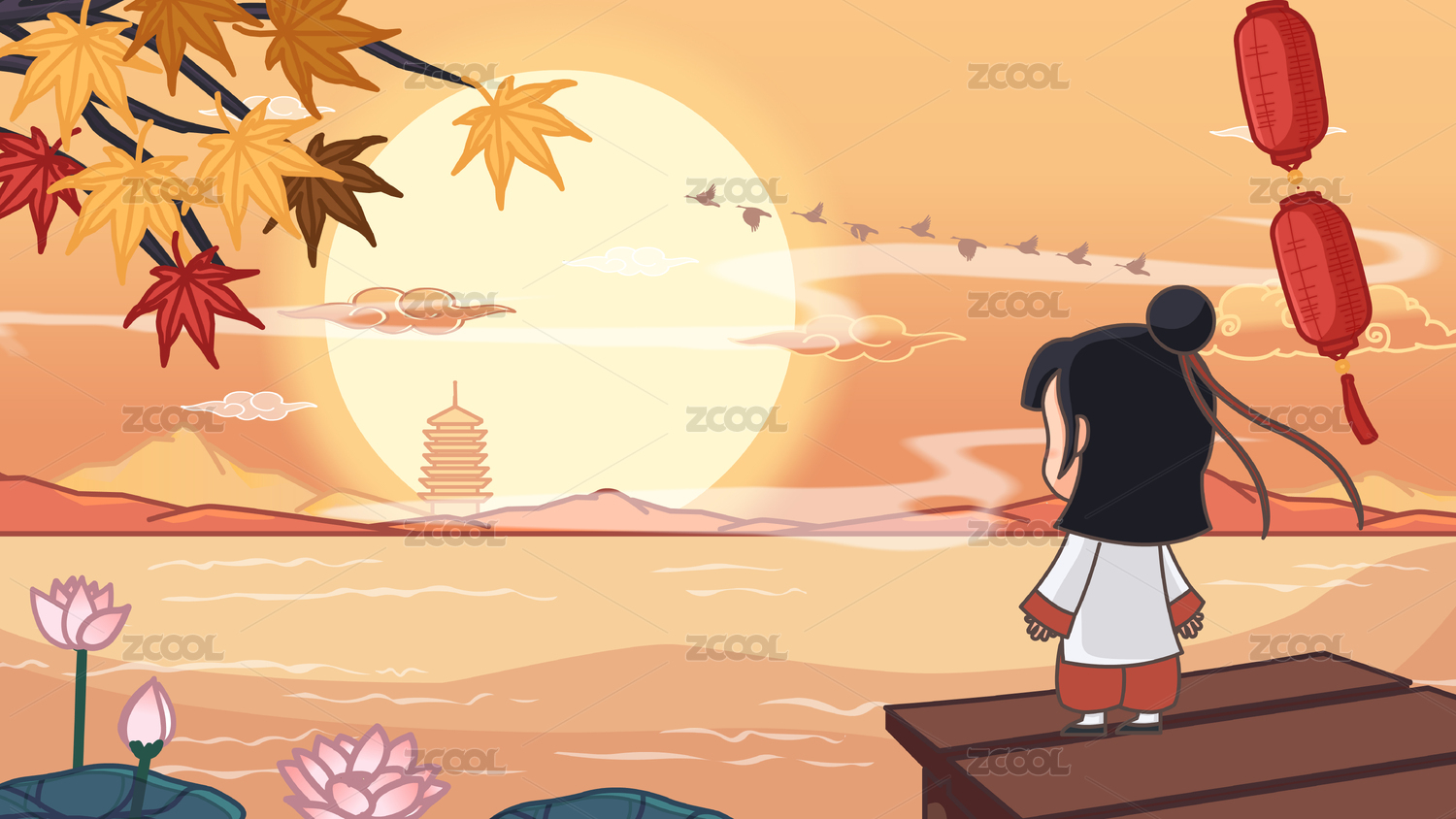 古代國(guó)風(fēng)楓樹下夕陽(yáng)中的湖邊遠(yuǎn)望的人
