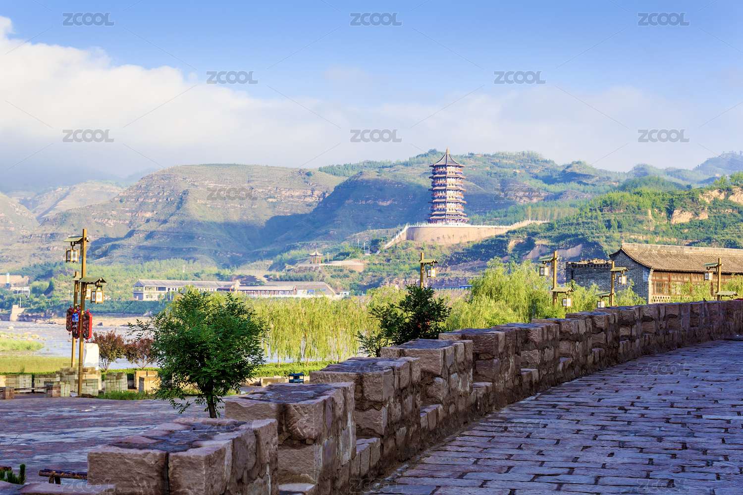中國(guó)山西省臨縣磧口古鎮(zhèn)遠(yuǎn)望寶塔風(fēng)光