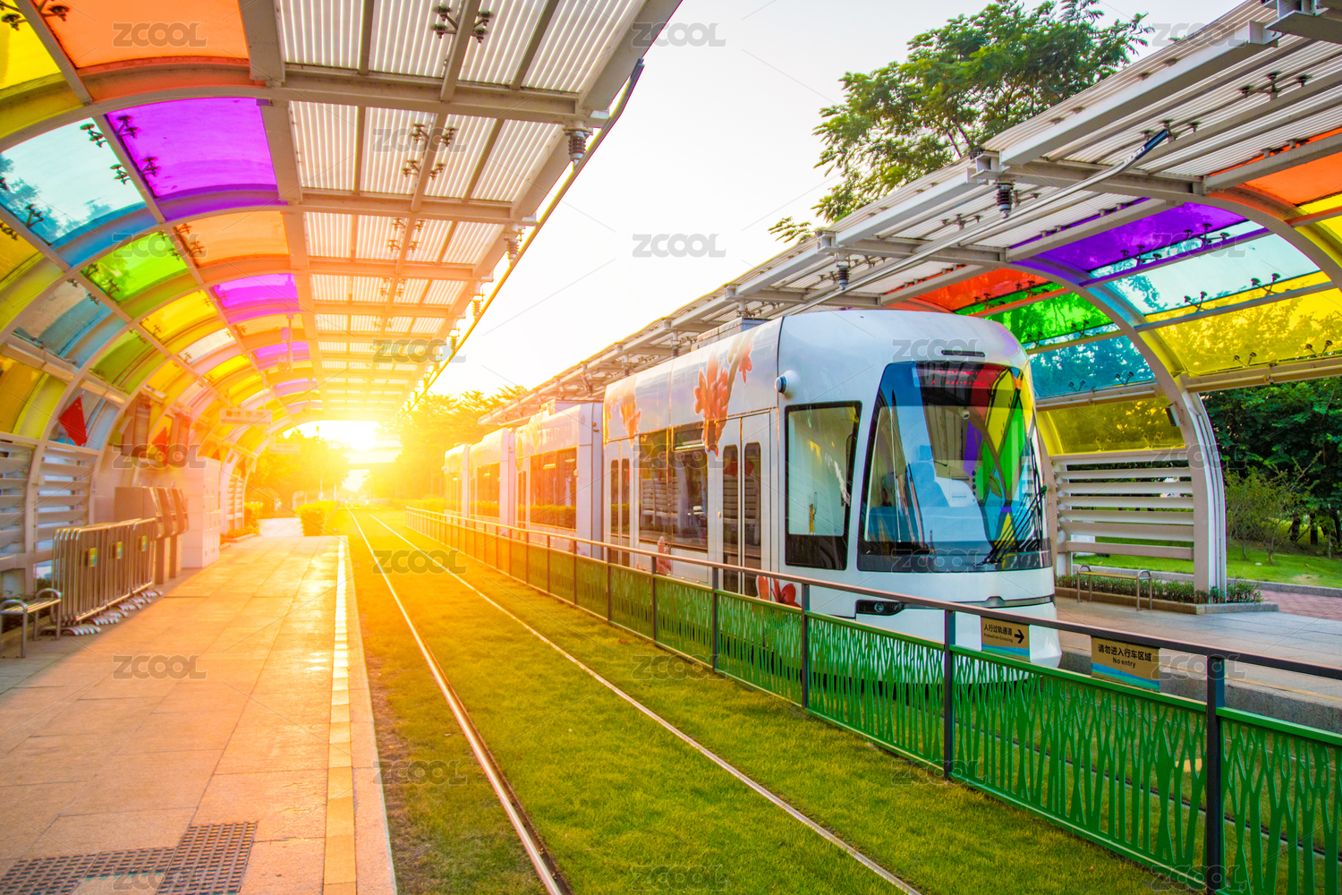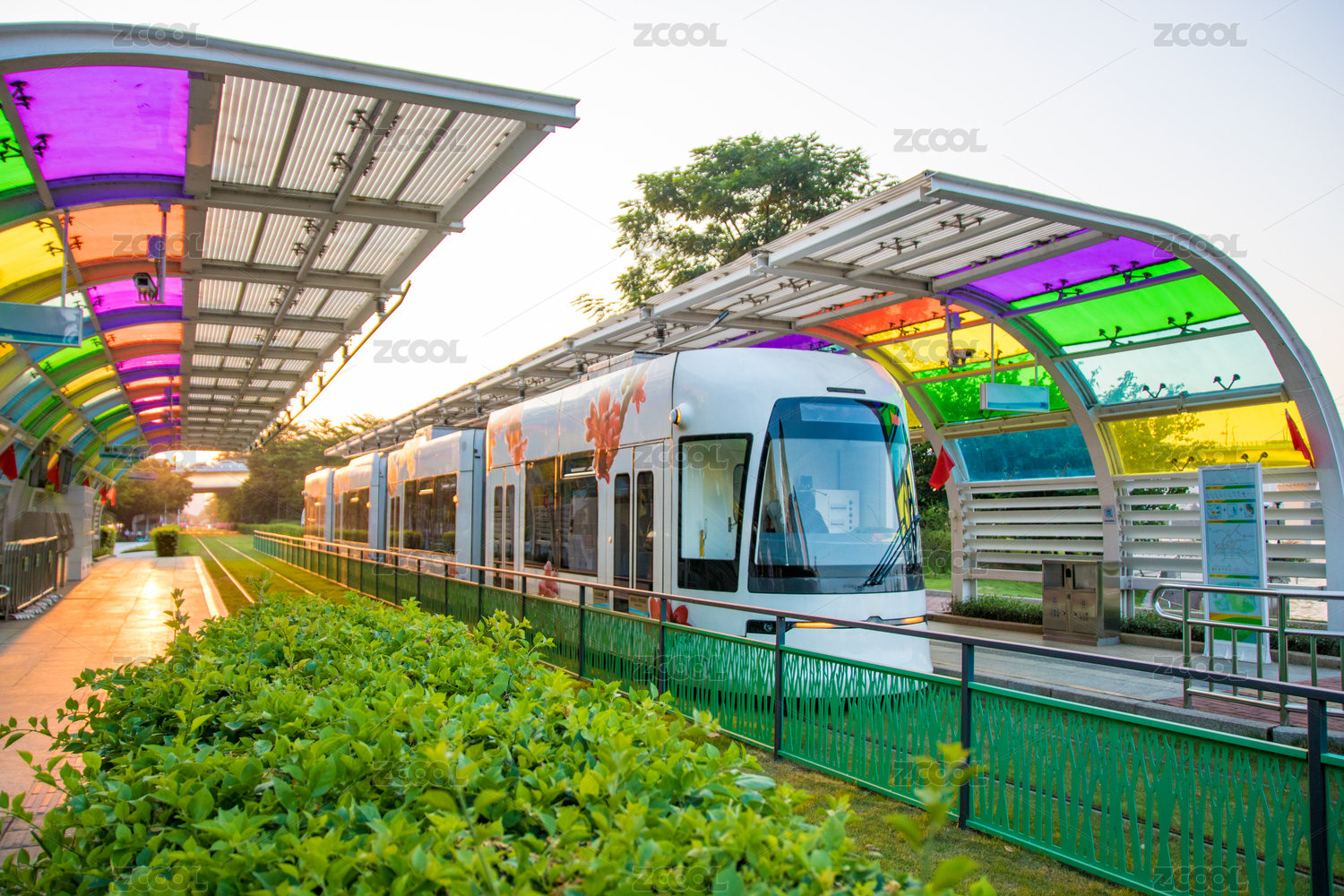 清晨陽光照耀的有軌電車車站