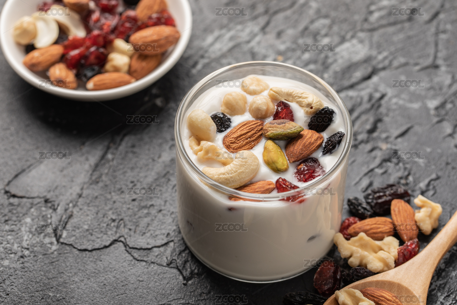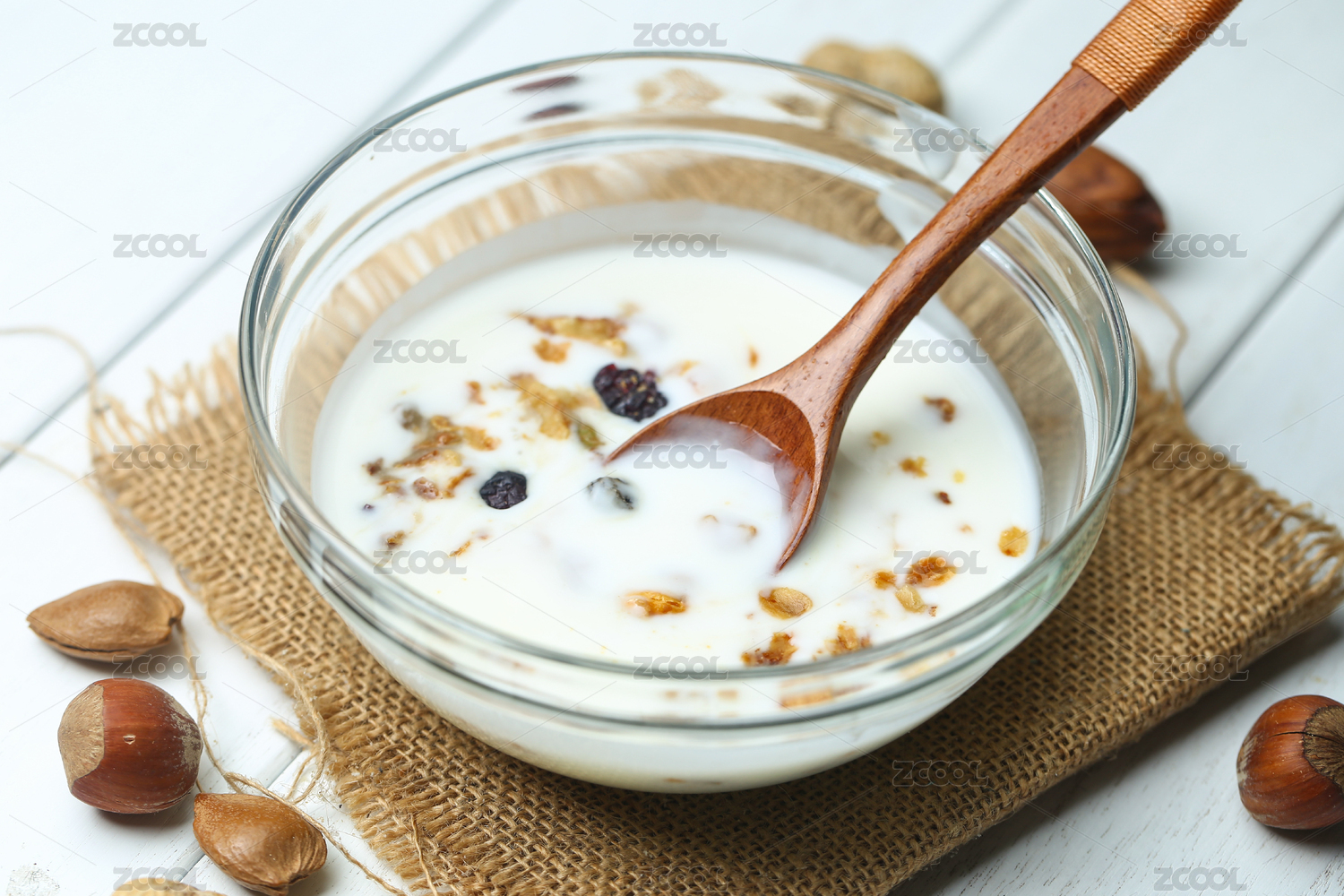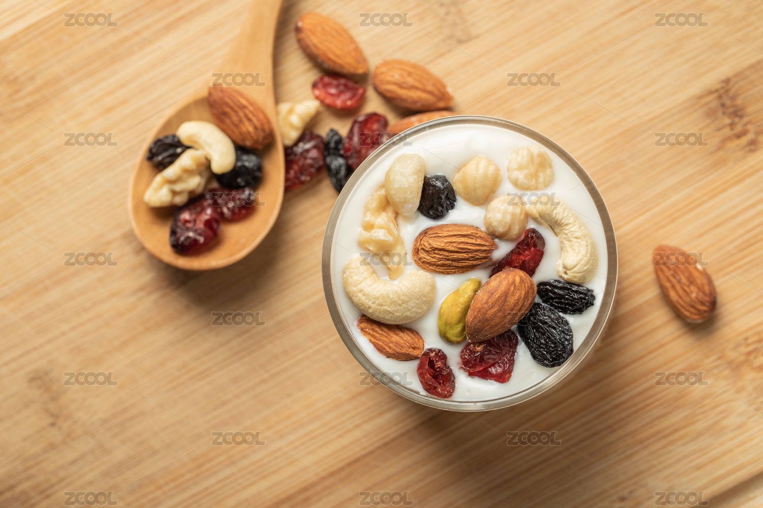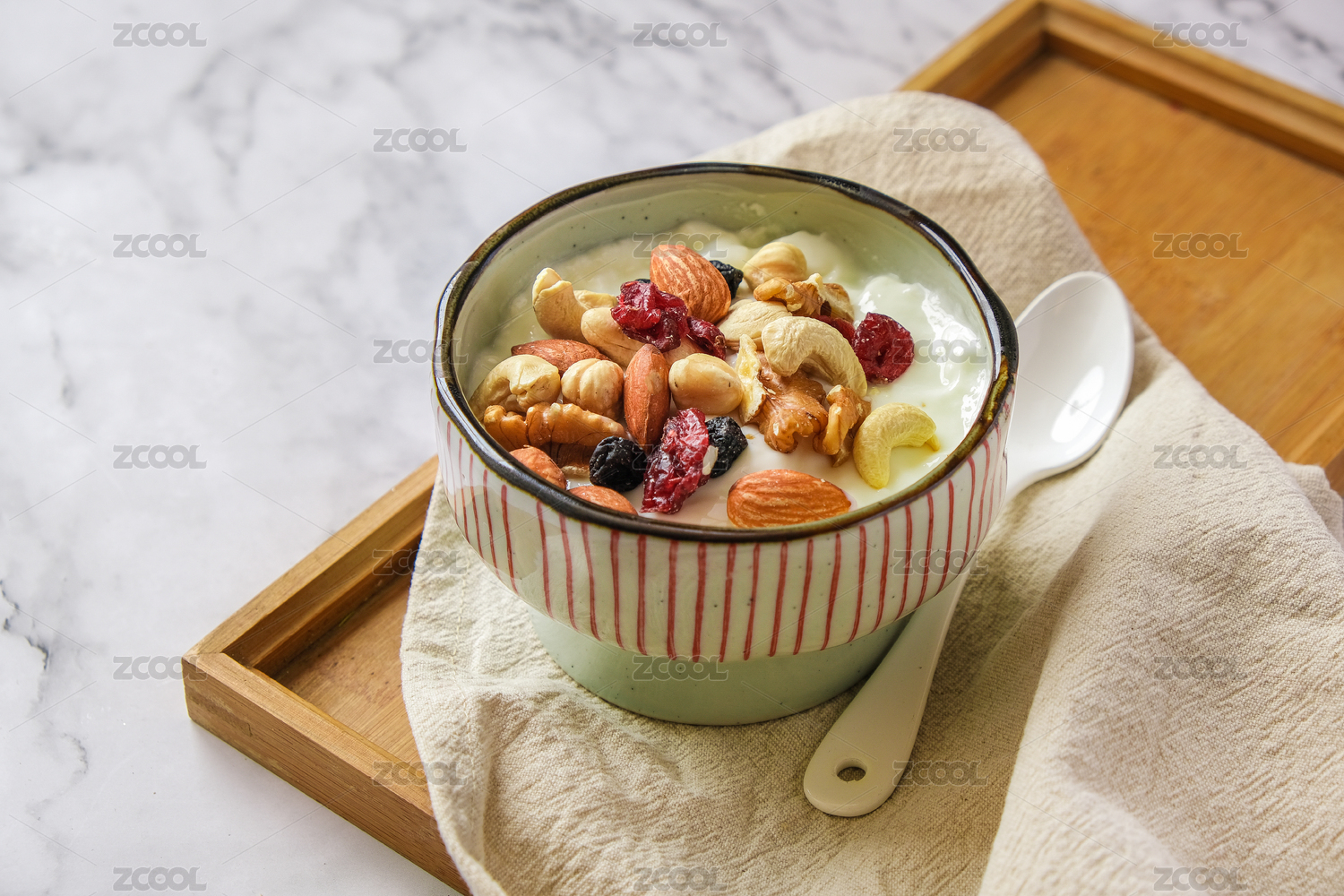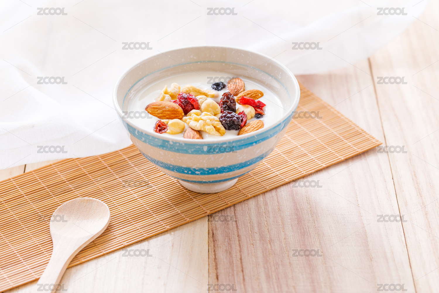 放在原木桌上的一碗新鮮果干堅(jiān)果酸奶
