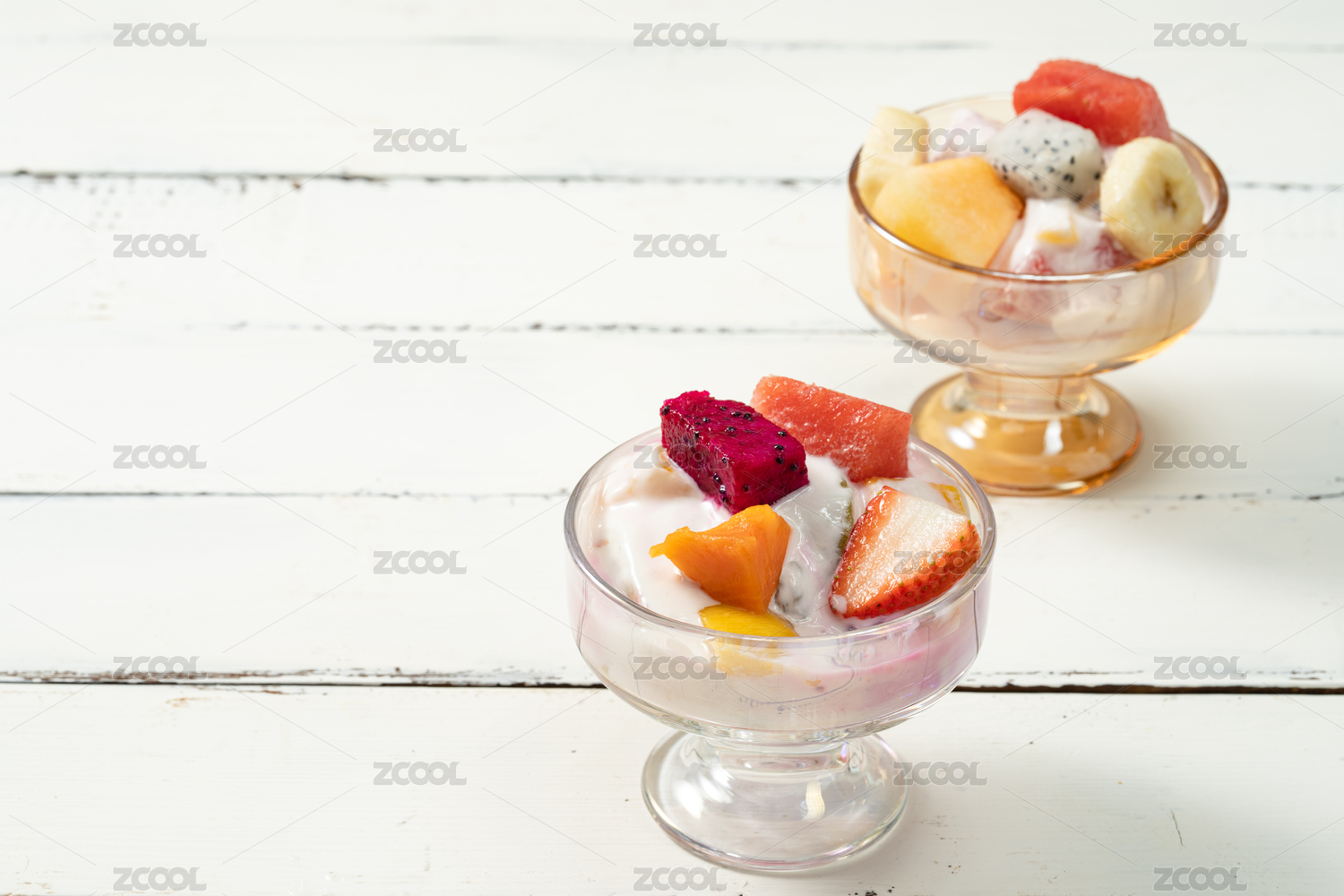 俯拍椰子裝著草莓藍(lán)莓水果酸奶沙拉