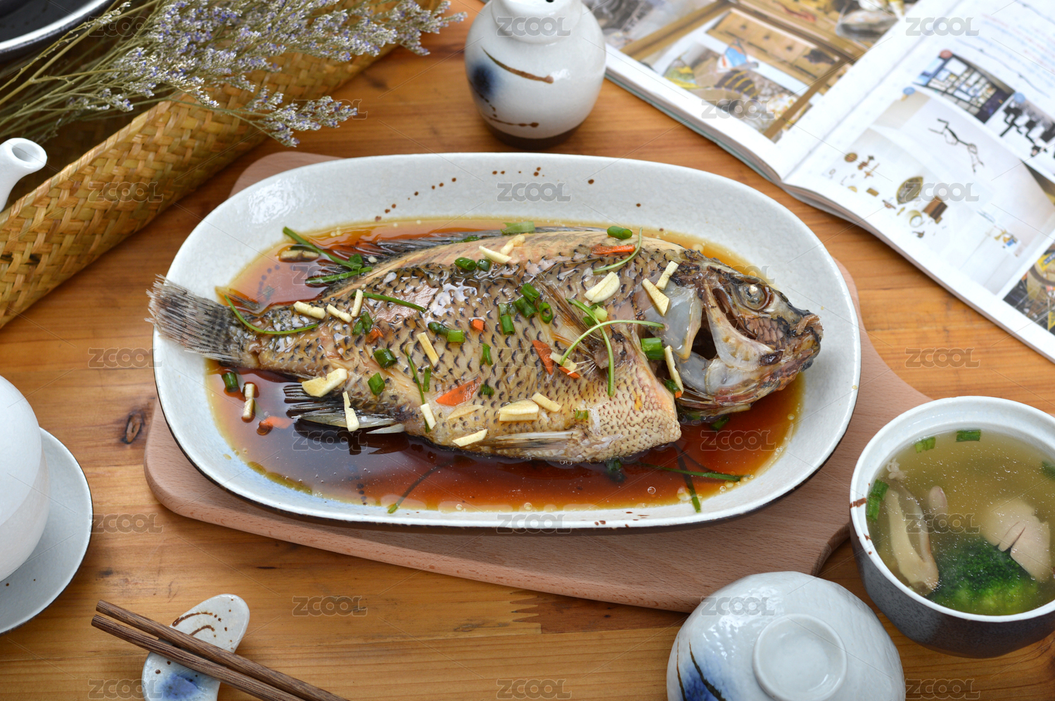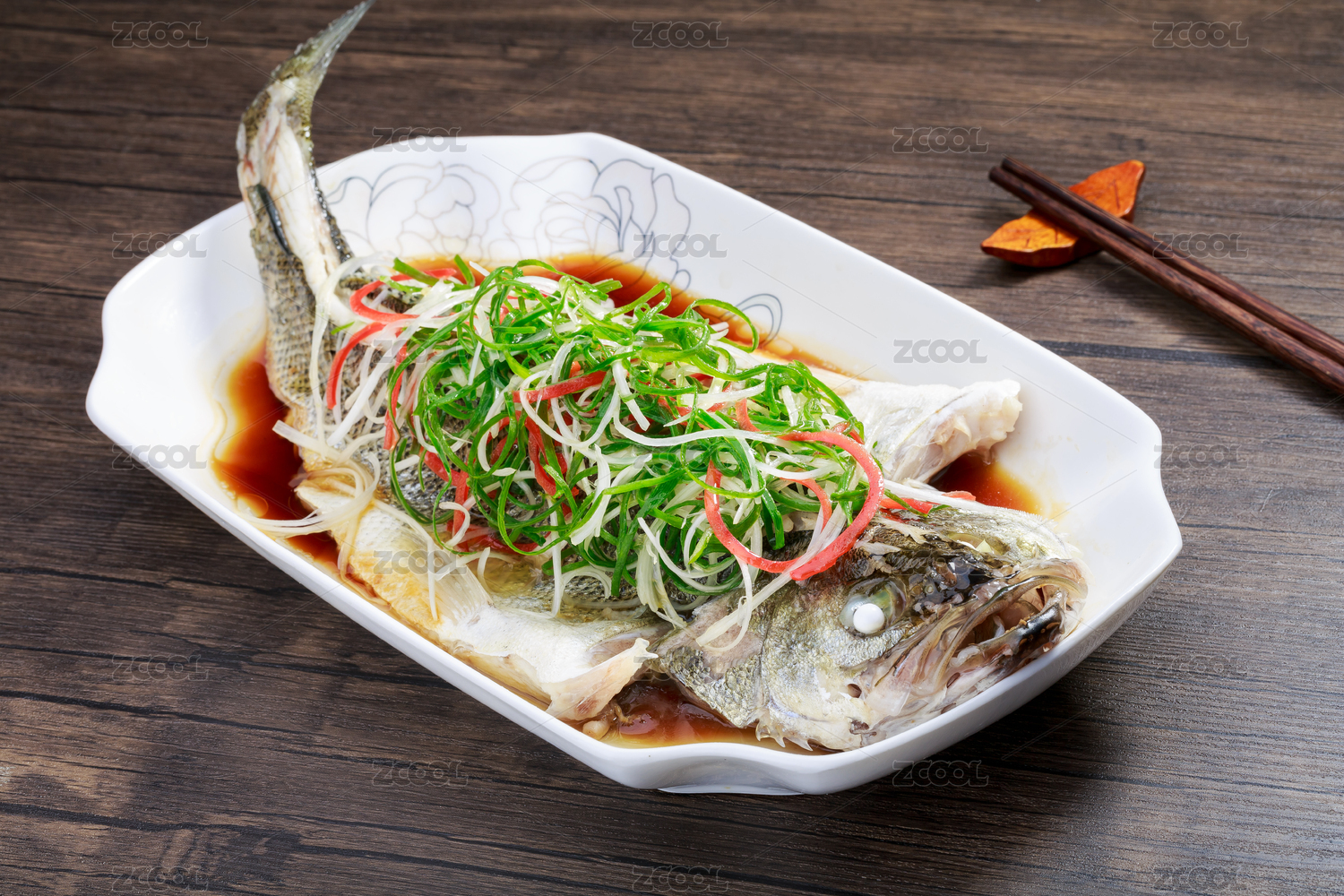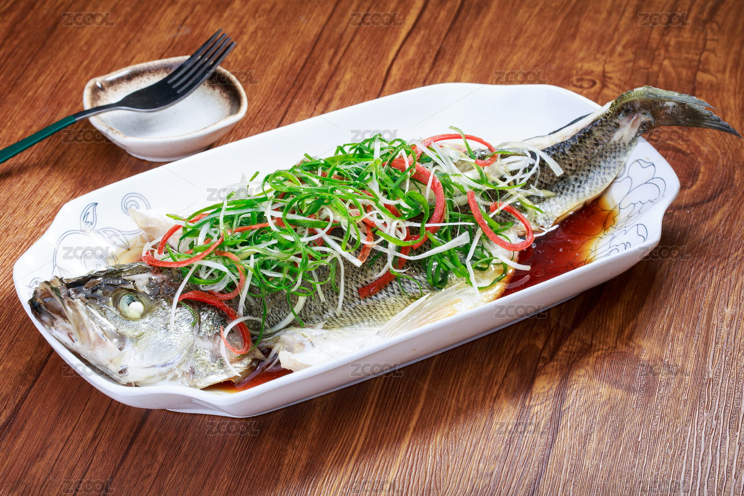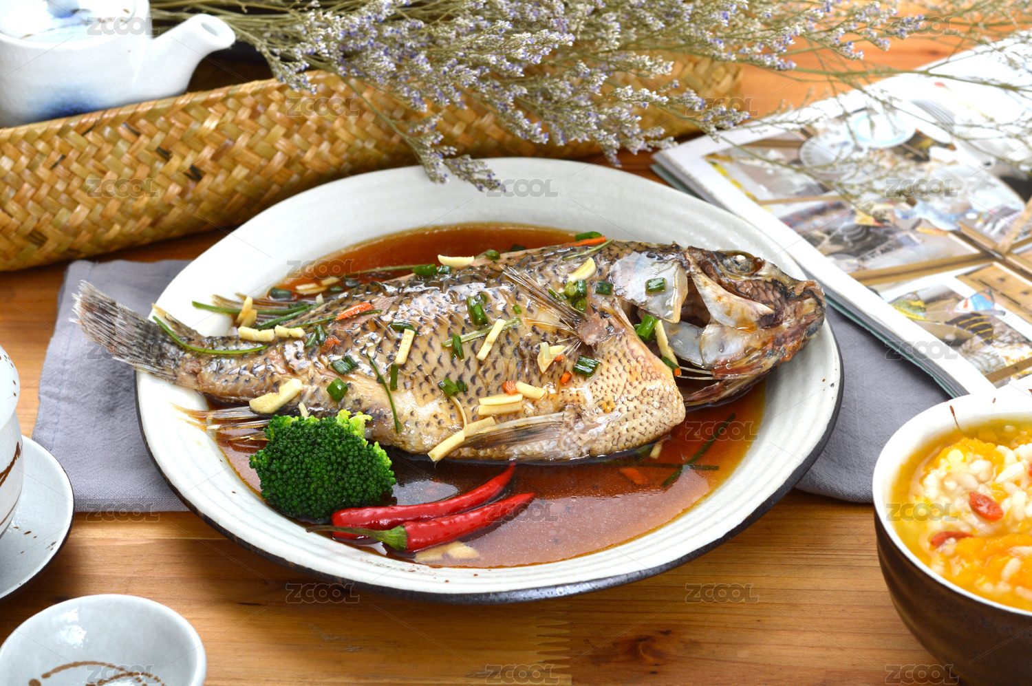 木桌上白盤的清蒸魚