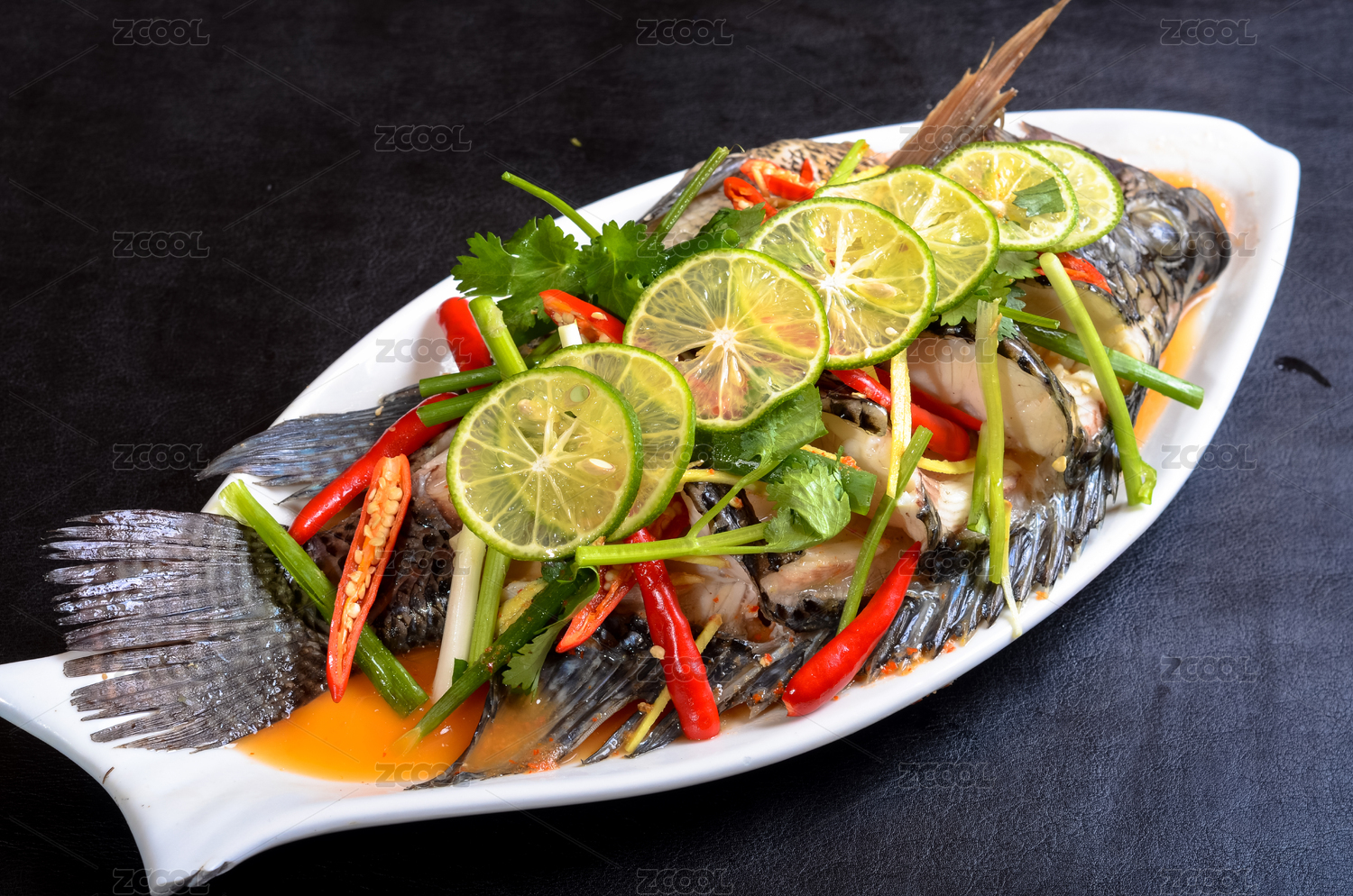 黑色背景上的清蒸羅非魚