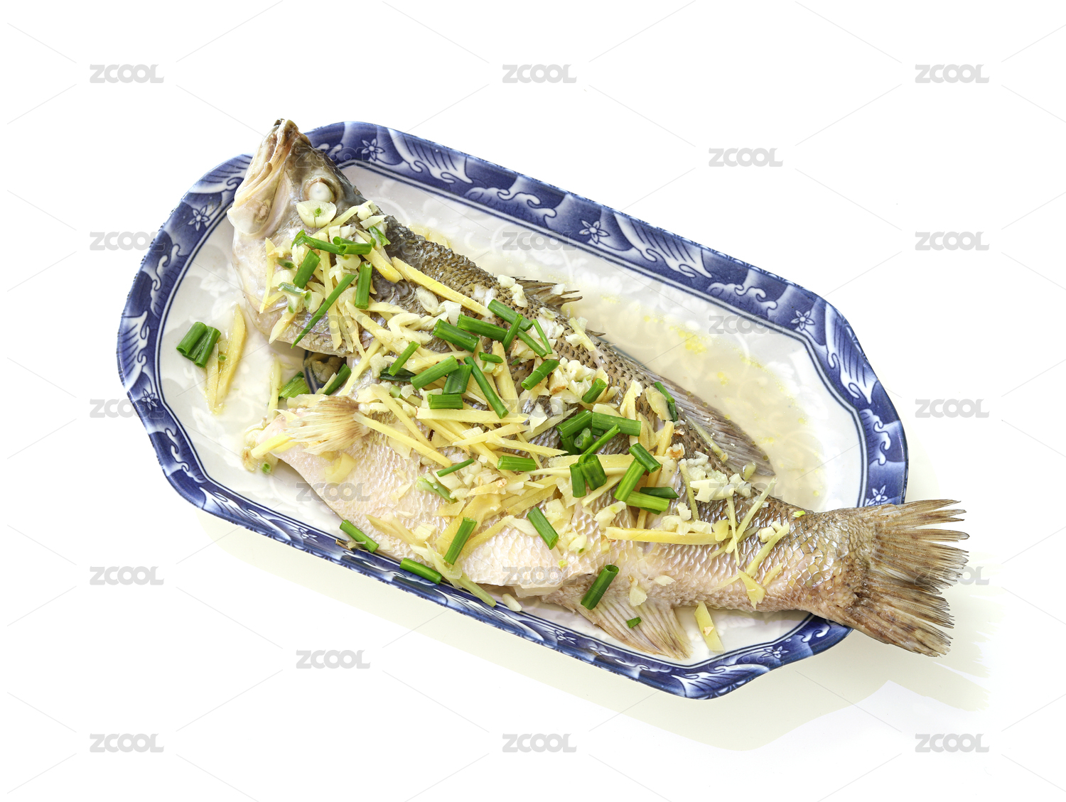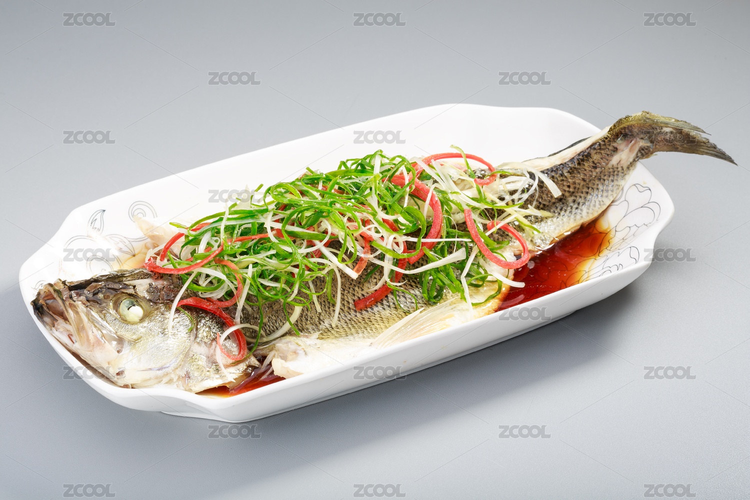白盤里的粵菜廣式蔥絲耗汁清蒸魚