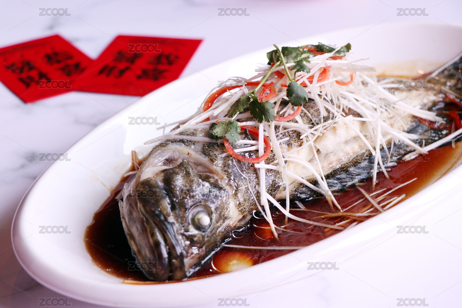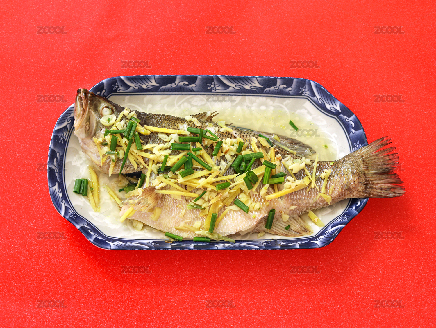 紅色背景上的一盤中餐清蒸魚