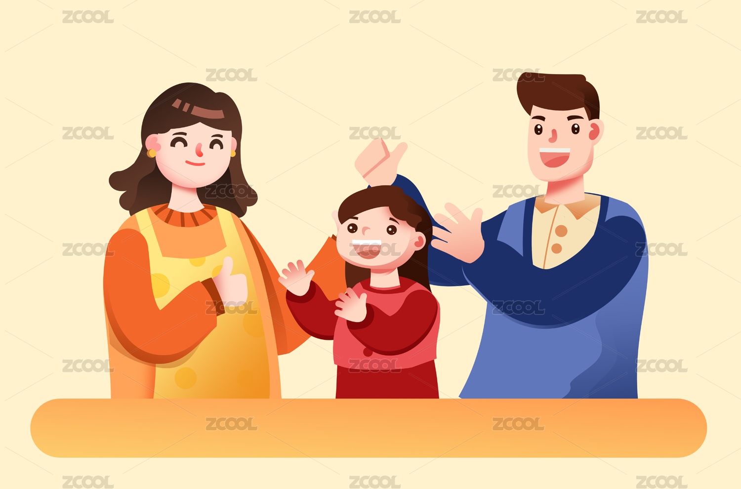 卡通手繪一家人三個人溫馨相親相愛插畫