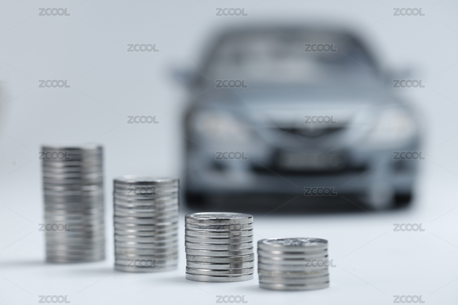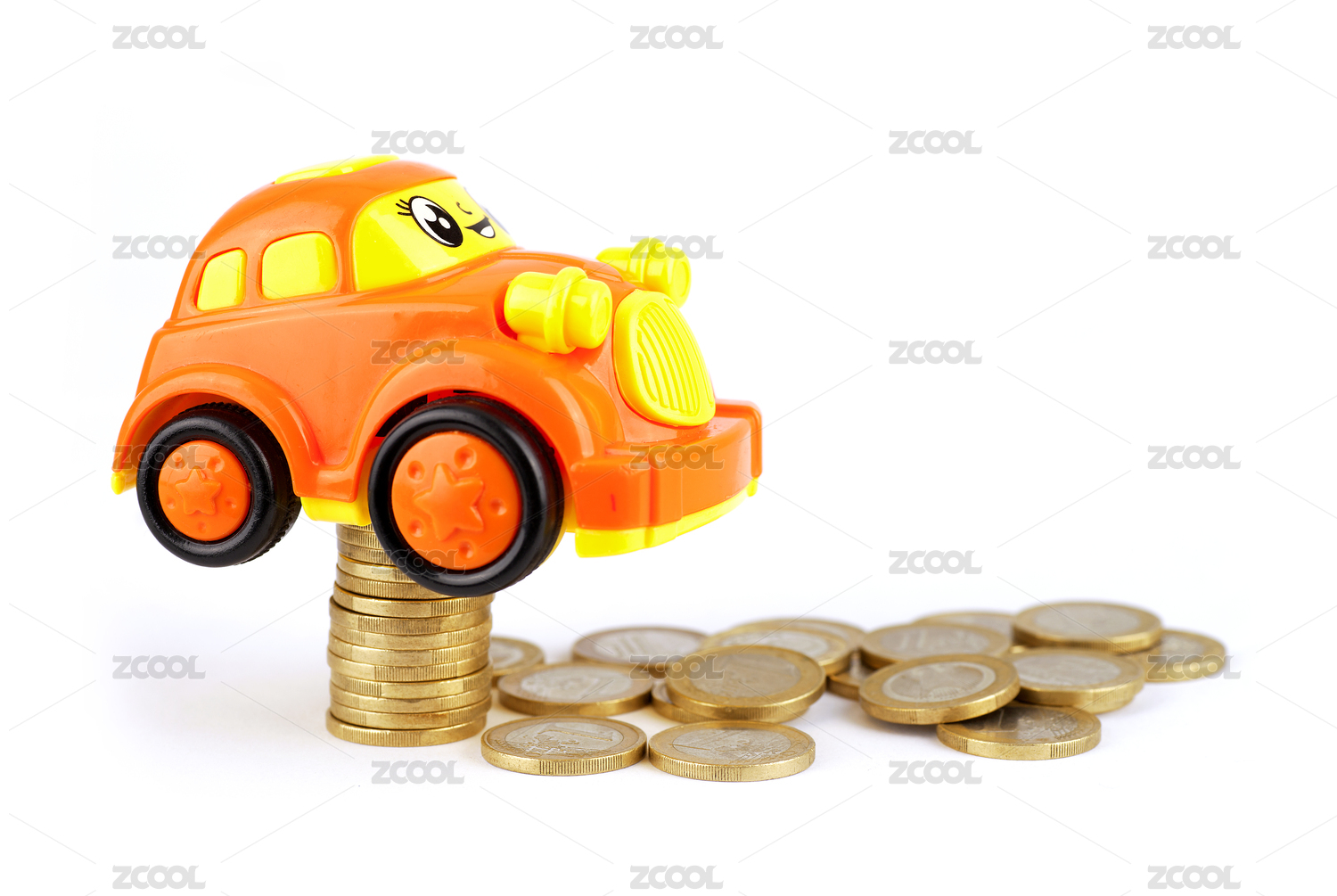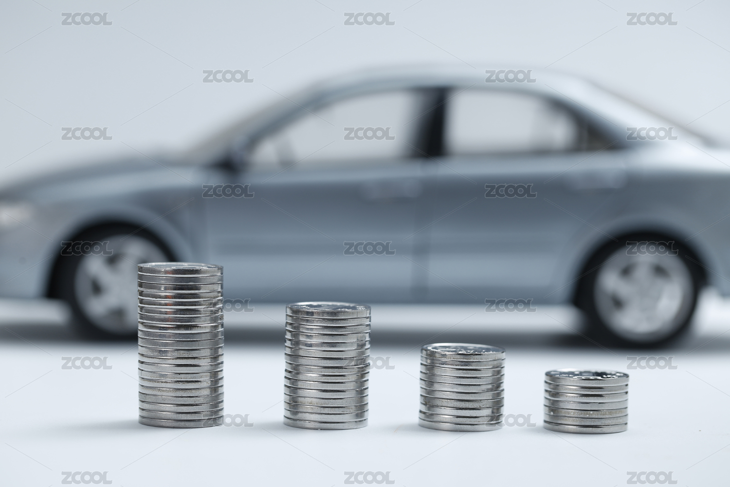 硬幣堆放在汽車模型前(汽車貸款交易租賃銷售概念)