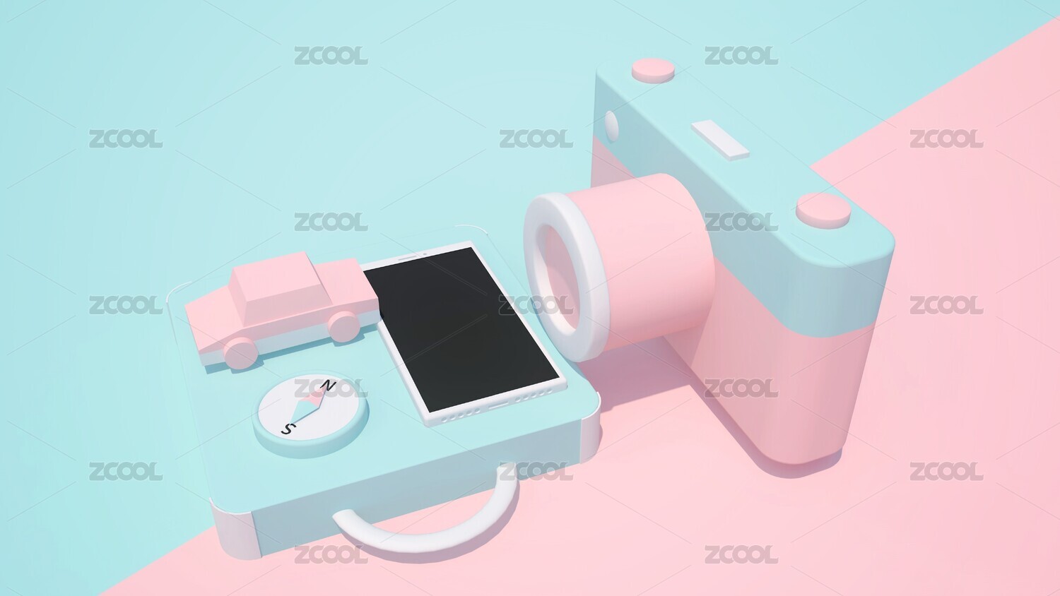 旅行計(jì)劃準(zhǔn)備,3D手機(jī)、指南針、鉛筆、相機(jī)、筆記本、汽車模型。