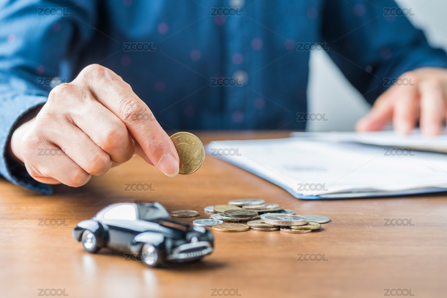 實(shí)木桌面上的復(fù)古汽車模型和拿著錢幣的手
