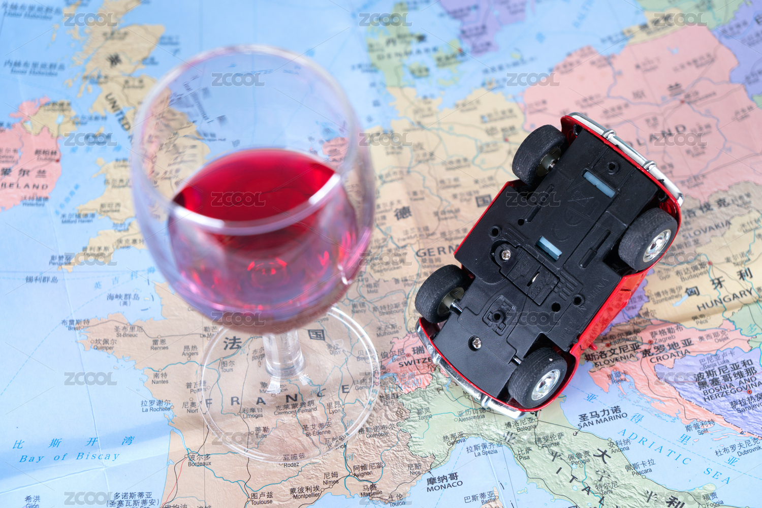 地圖上一杯紅酒和一輛翻了的汽車模型