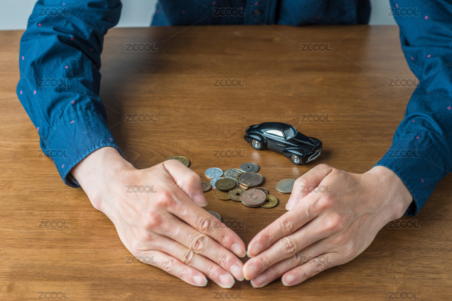 實(shí)木桌面上被雙手?jǐn)n住的錢幣和復(fù)古汽車模型