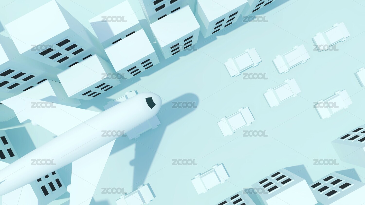 旅游途中飛機(jī)飛過城市上空,3D飛機(jī)、建筑、汽車模型概念場(chǎng)景。