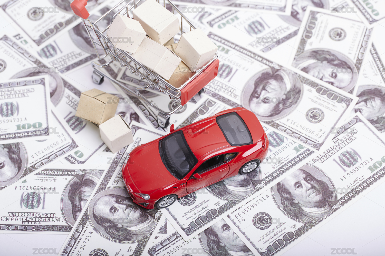 放在美元上的汽車模型和貨幣