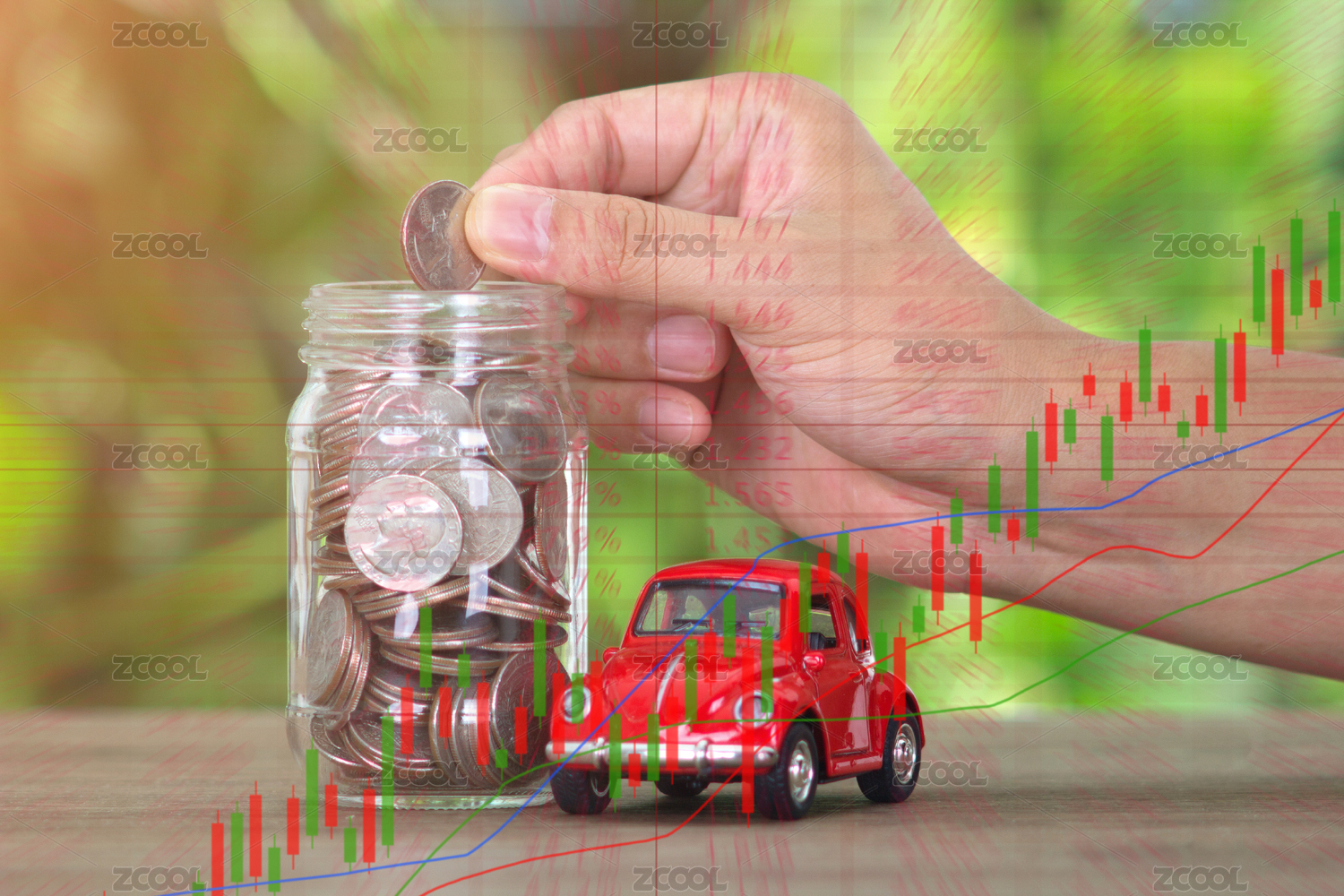 虛化綠植背景前滿裝美元硬幣的玻璃瓶和汽車模型