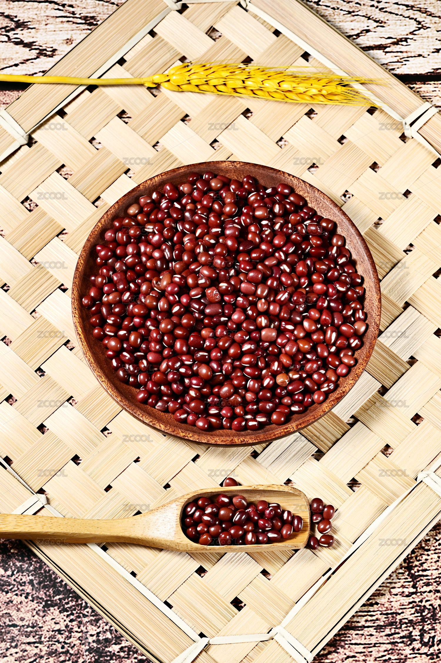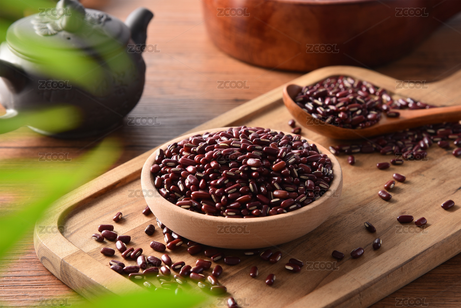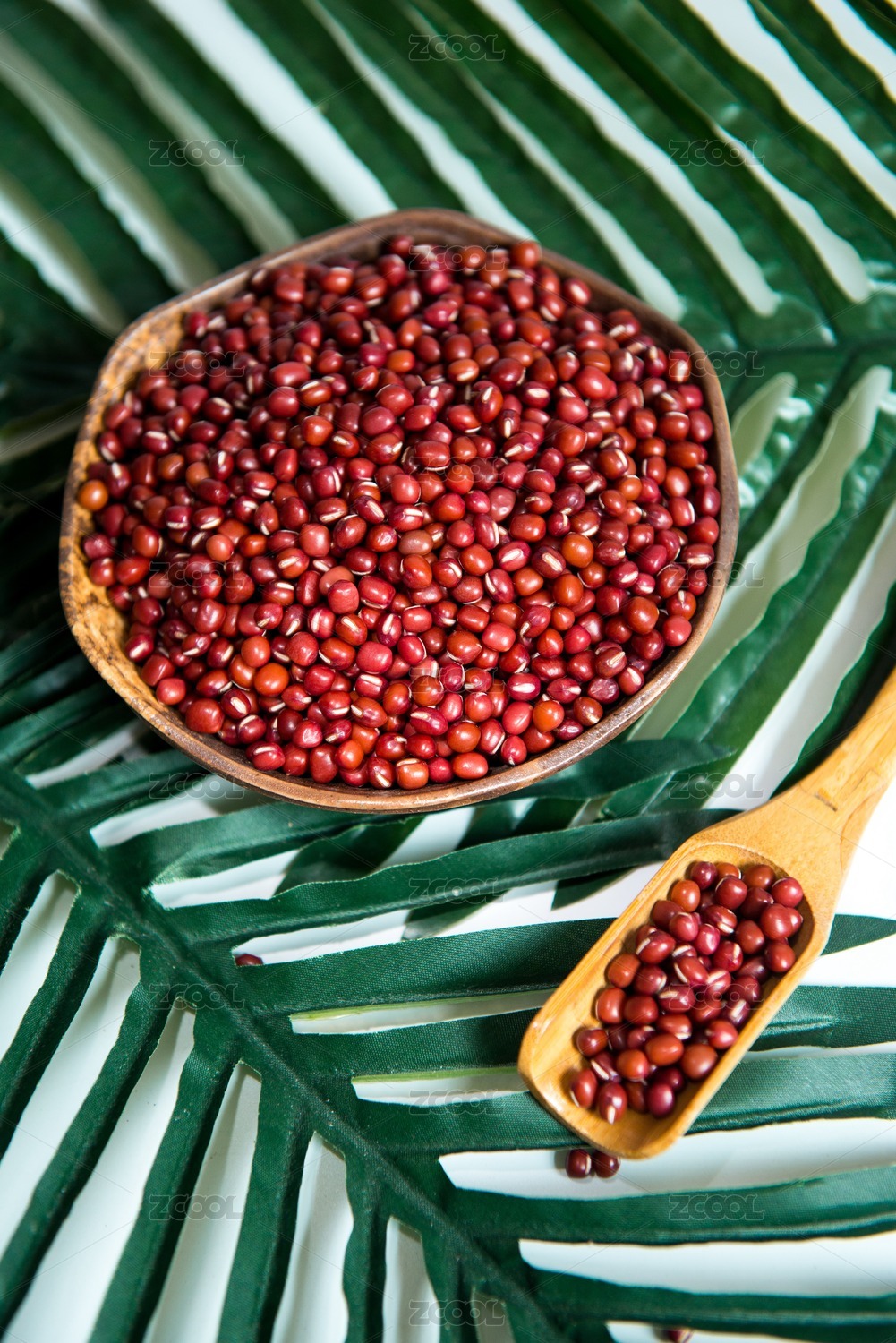 綠葉背景碗里木勺里的赤豆紅豆