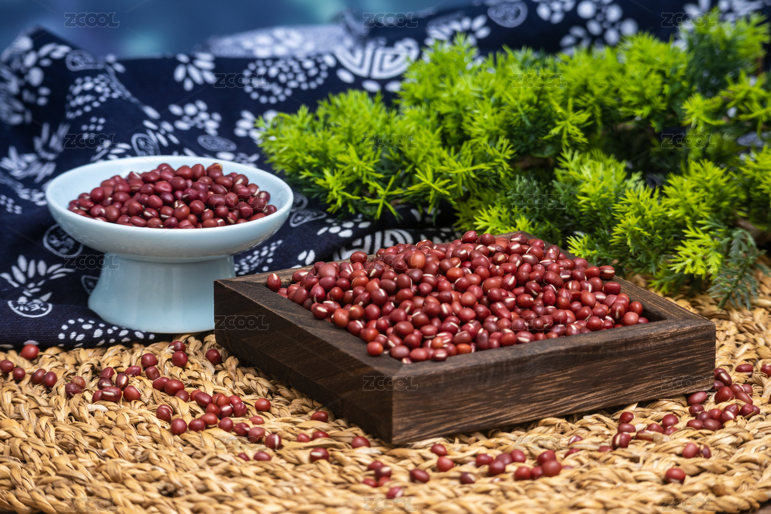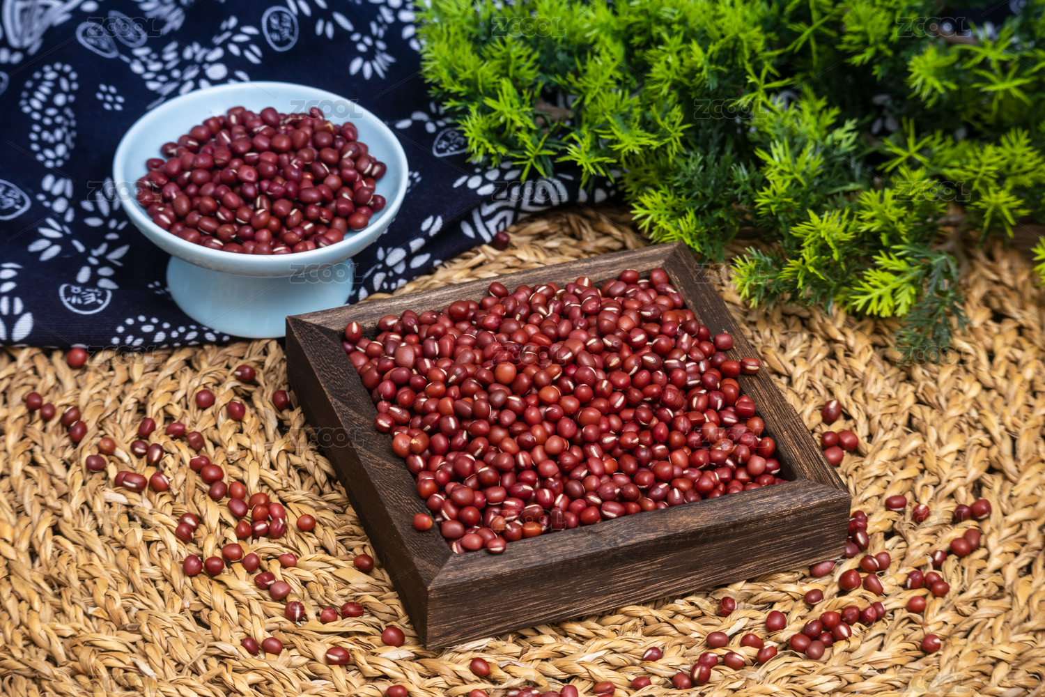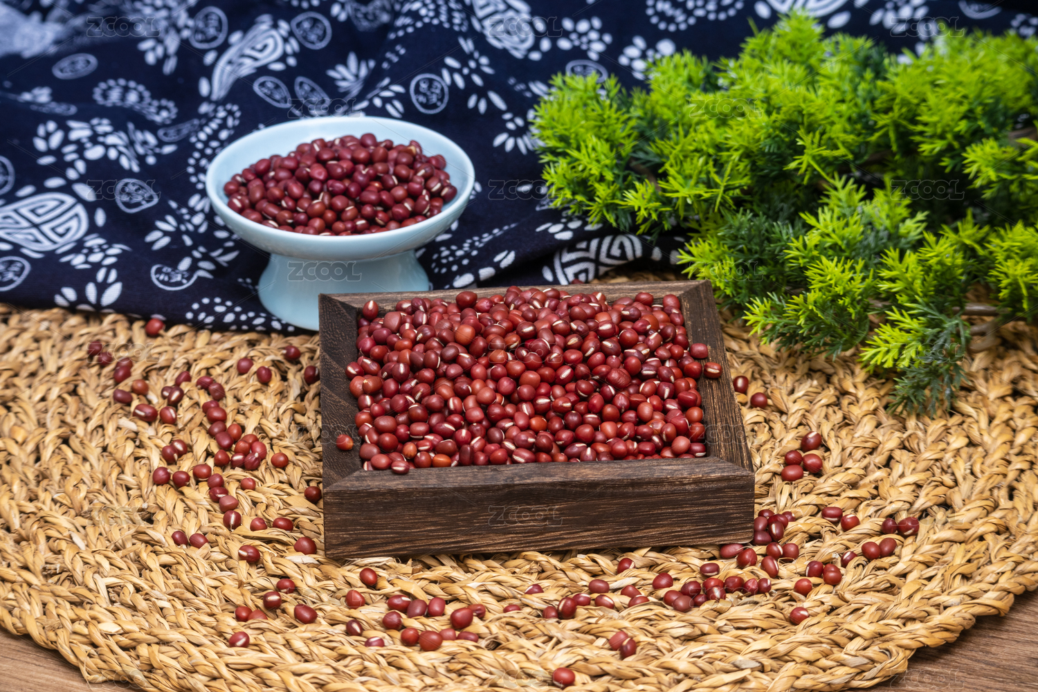 綠葉背景碗里木勺里的赤豆紅豆