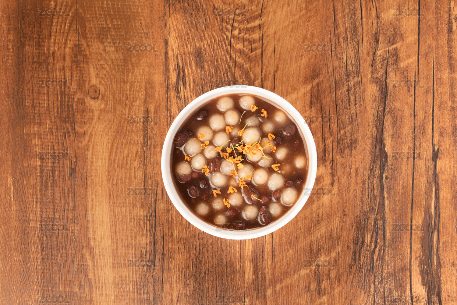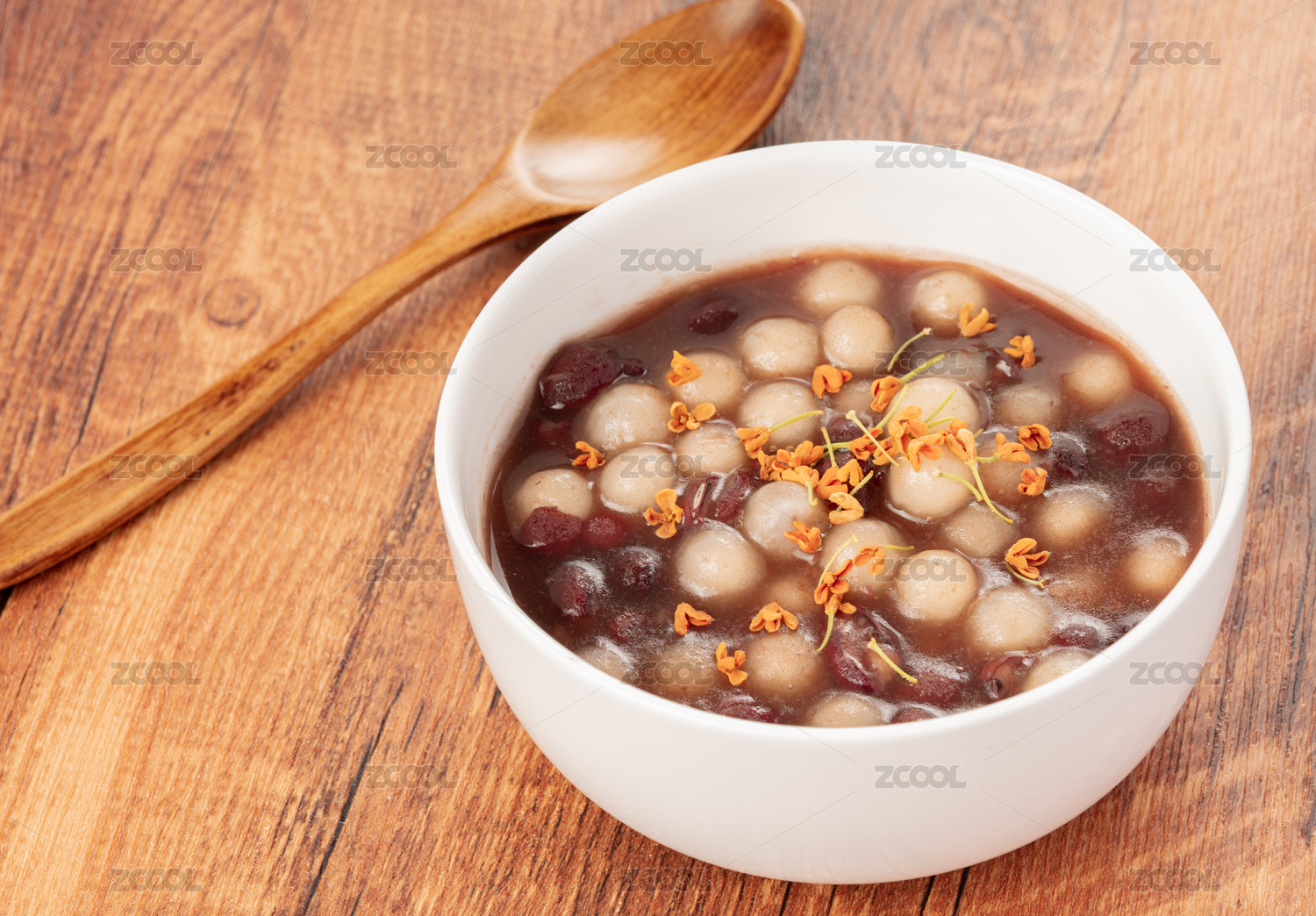 實木桌面上擺著一碗赤豆元宵配桂花