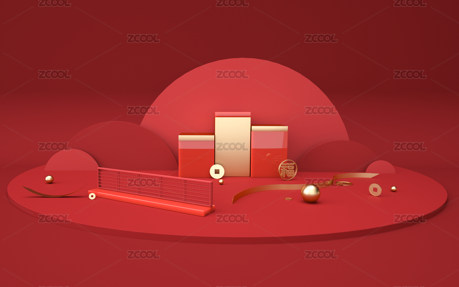 紅色背景下的金色球和臺子
