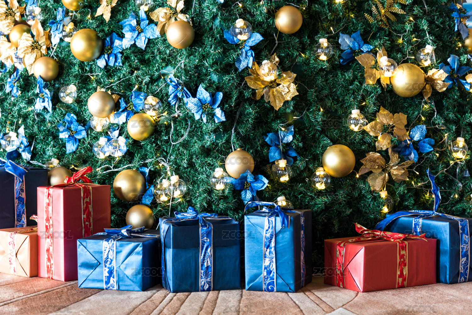 掛滿金球的人造圣誕樹和彩色禮物盒