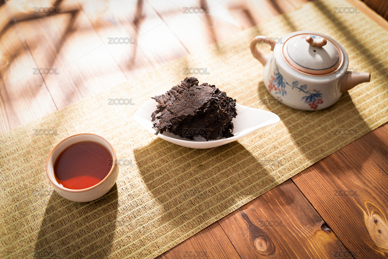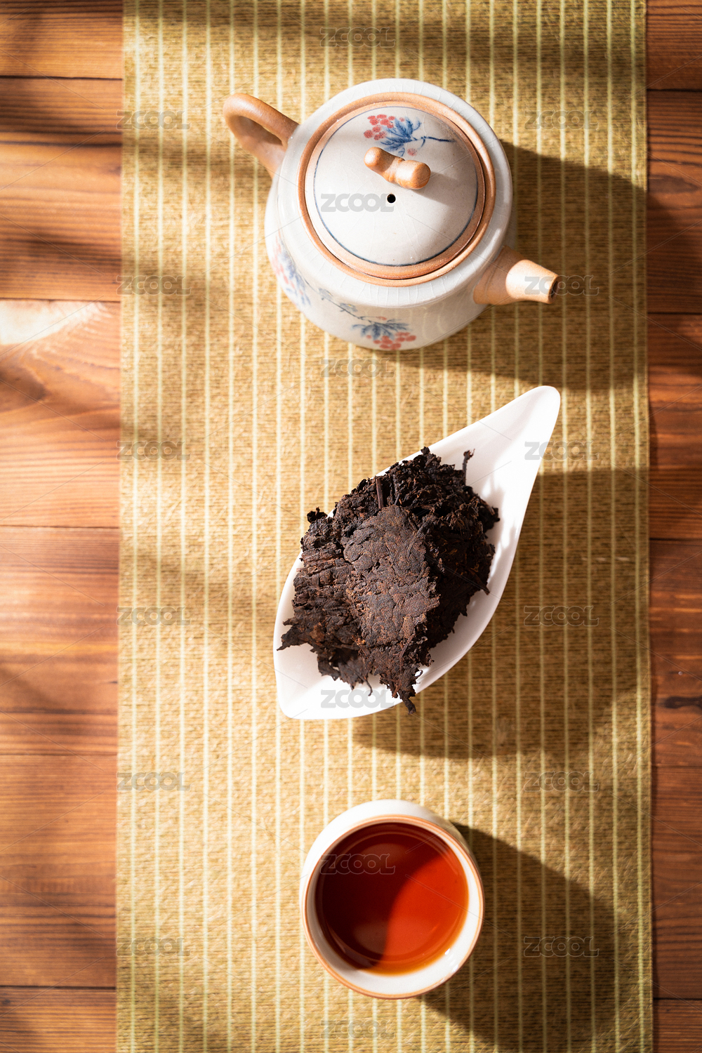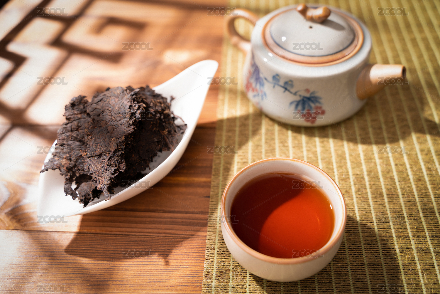 木紋桌亞麻茶席上放著茶壺和普洱茶湯