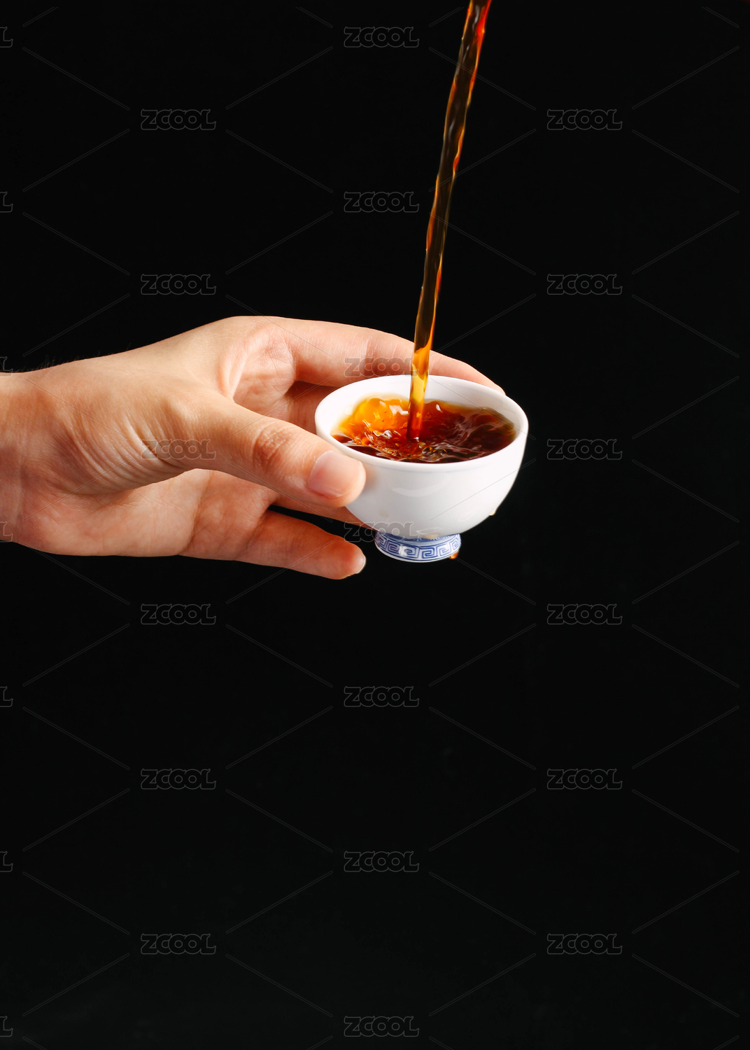 手舉藍色花紋杯子接住褐色普洱茶湯