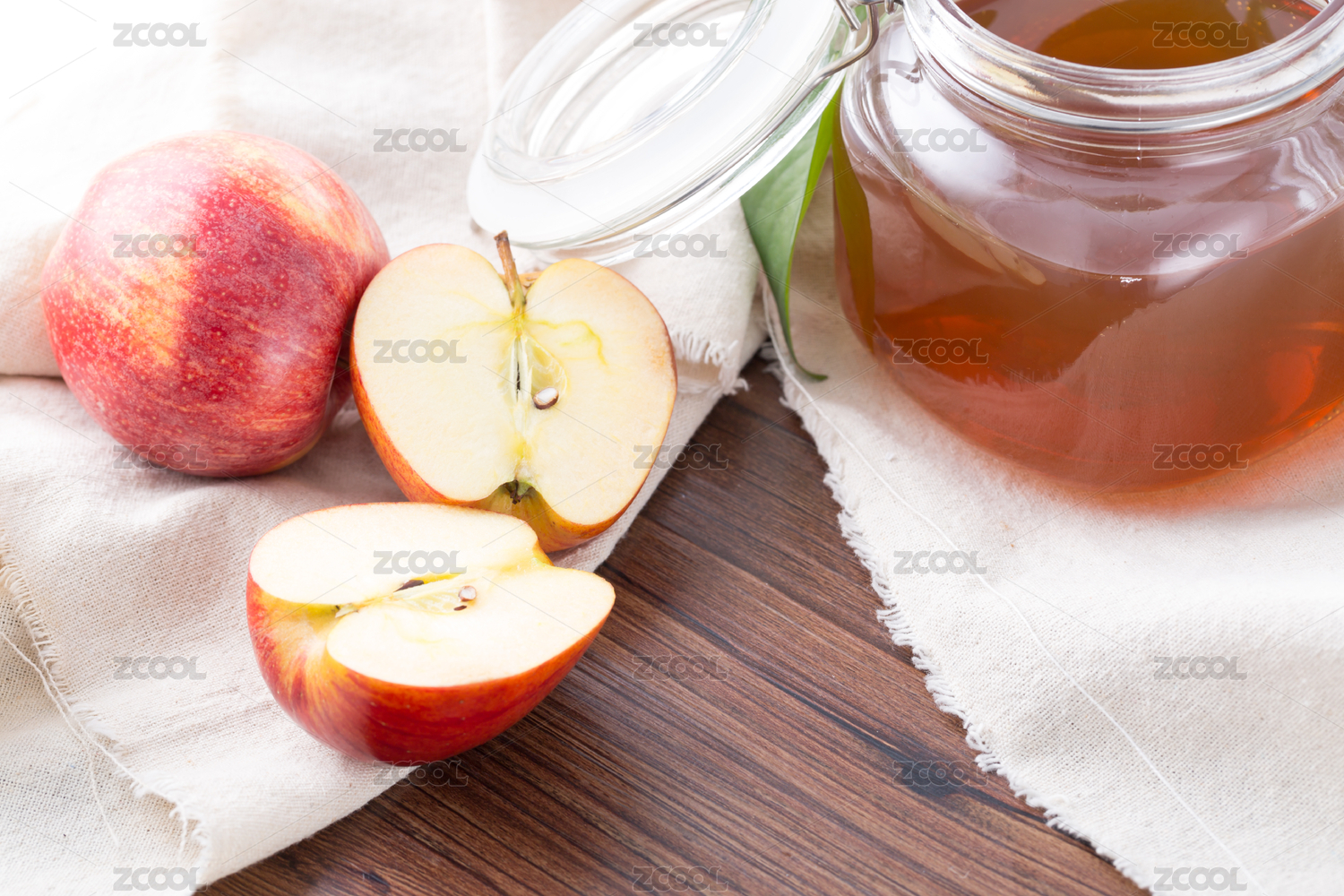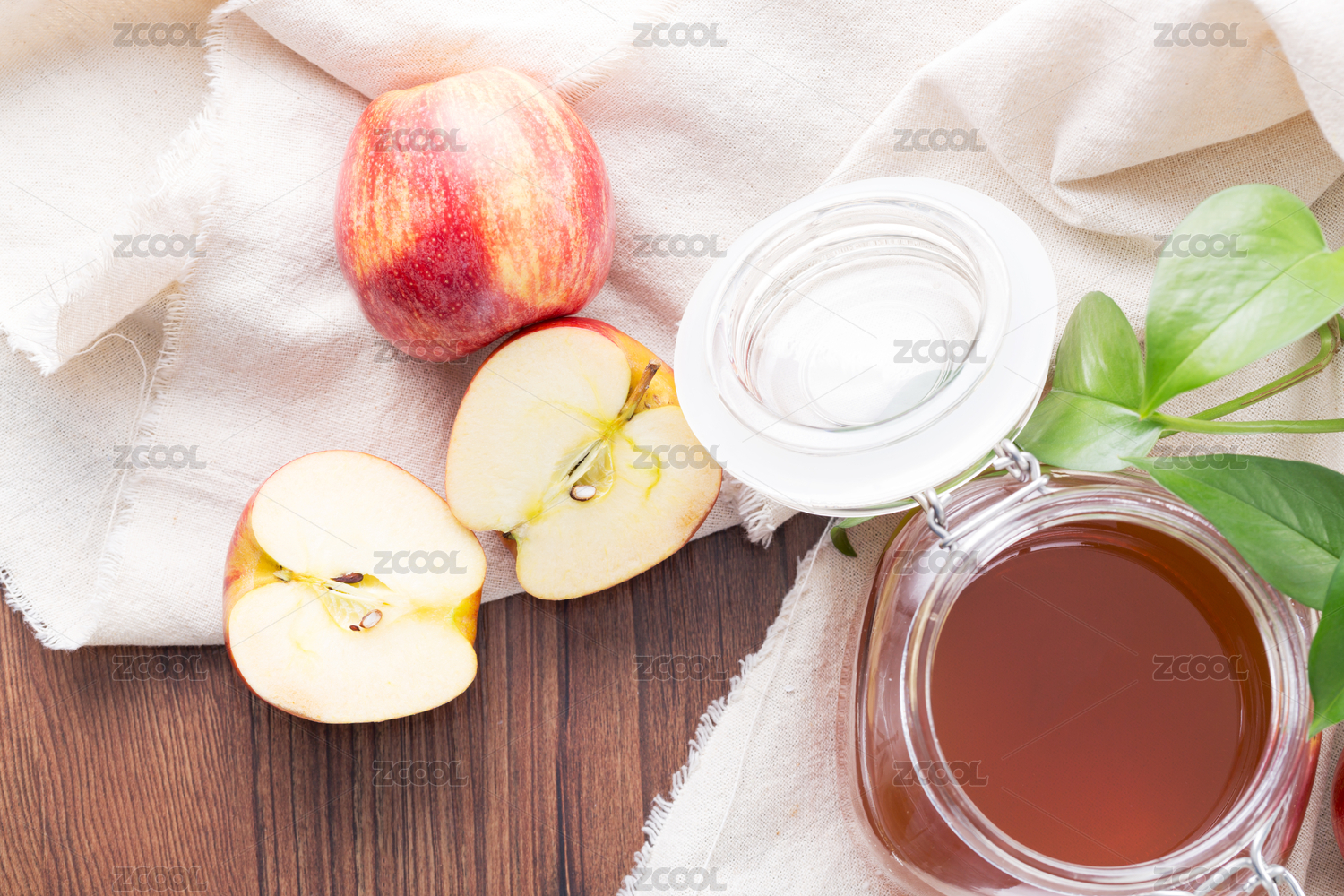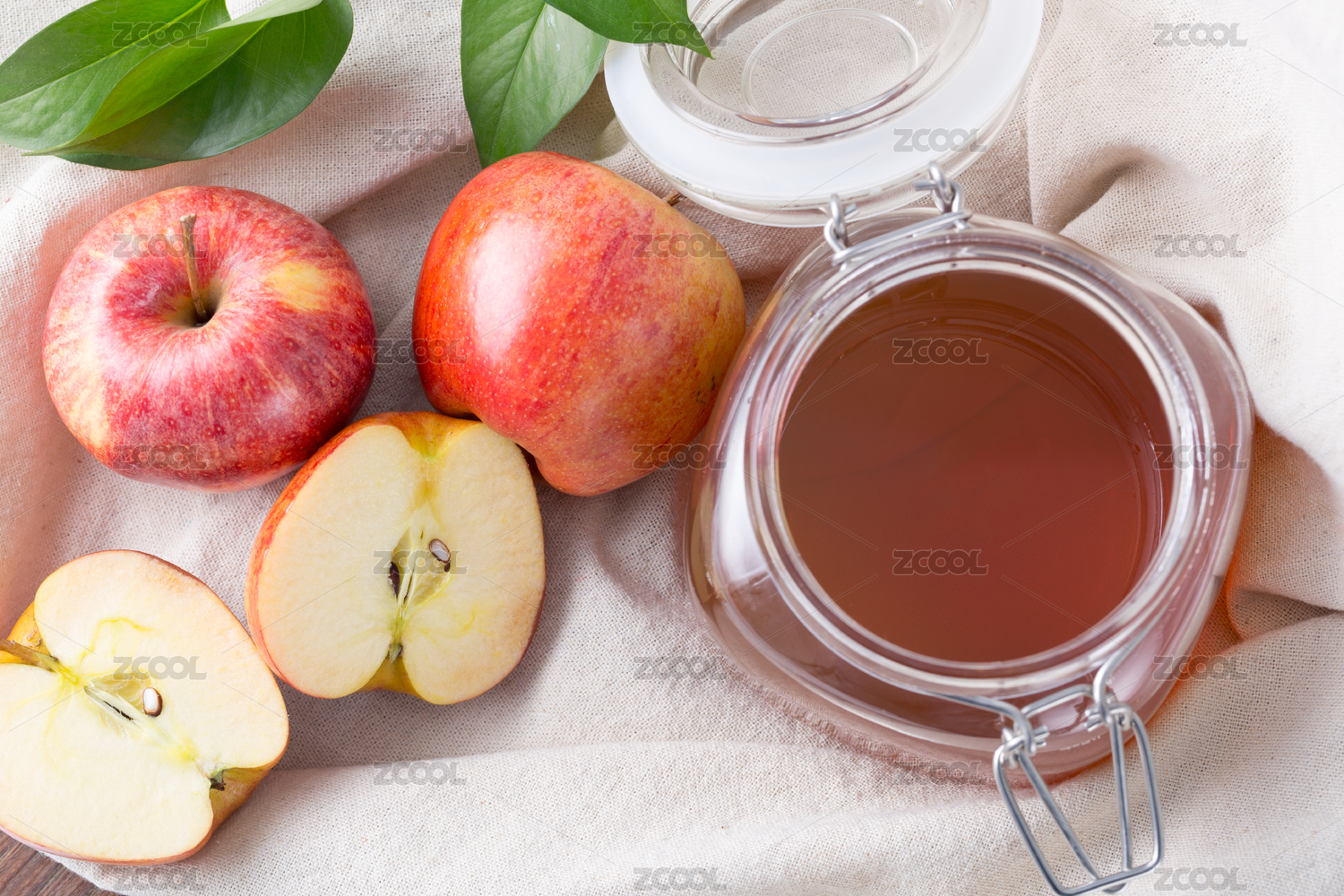 新鮮的蘋果和在玻璃罐子里的蘋果醋,蘋果飲料