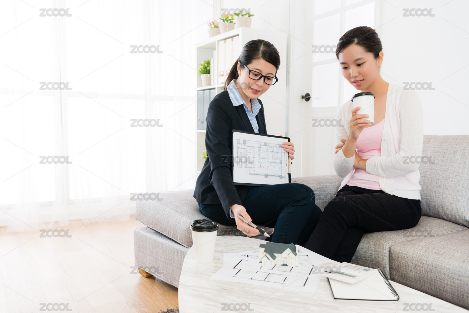 友好的年輕商業(yè)代理小姐與客戶交談,并指向仿真微縮模型房子說明討論建筑設(shè)計施工。